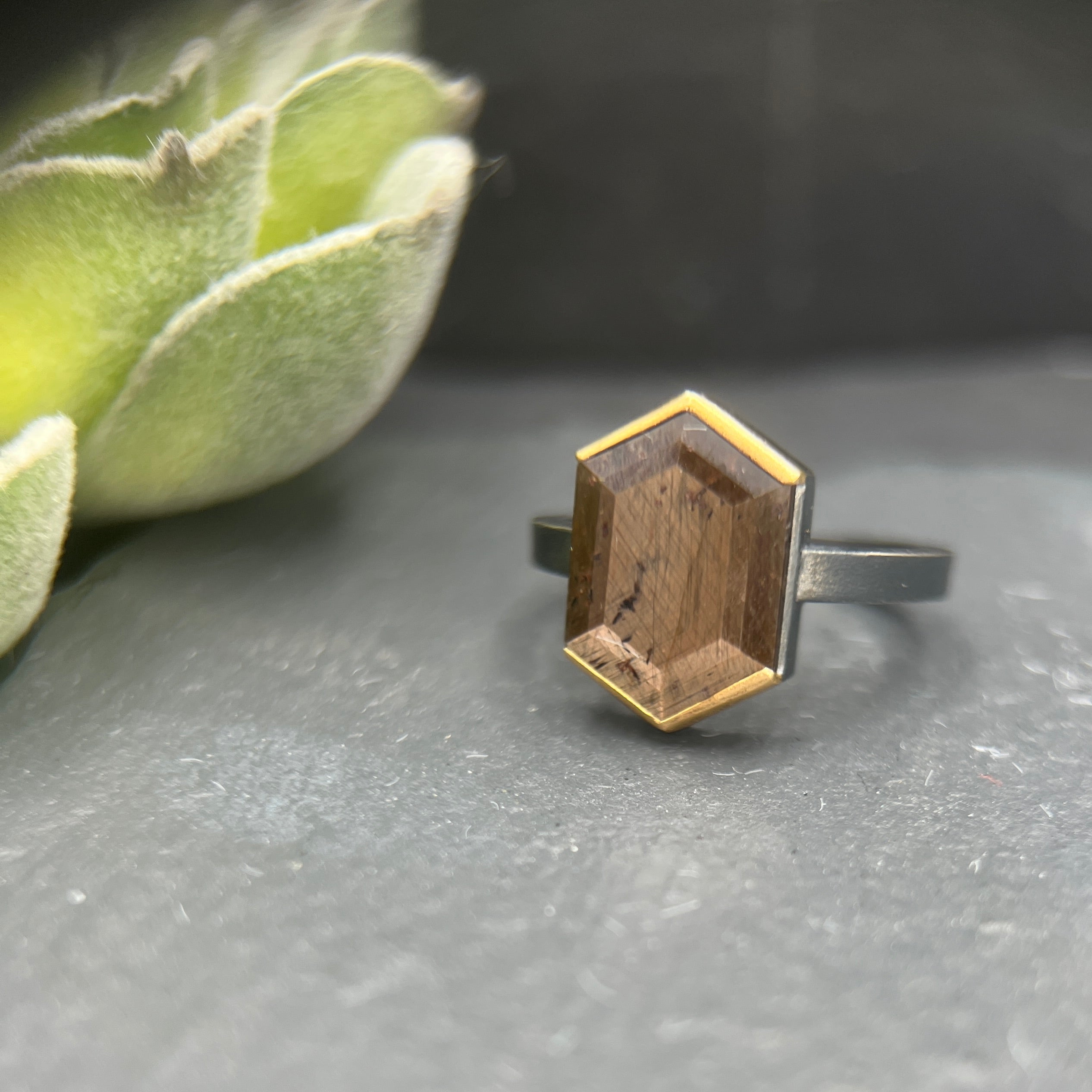 Simple, yet elegant, this ring features a 5ct, bronze sapphire in a elongated hex tablet cut, framed by an 18k yellow gold partial bezel. The gold is contrasted by a foundation in oxidized silver. This ring is a size 6.25 and is sizable.