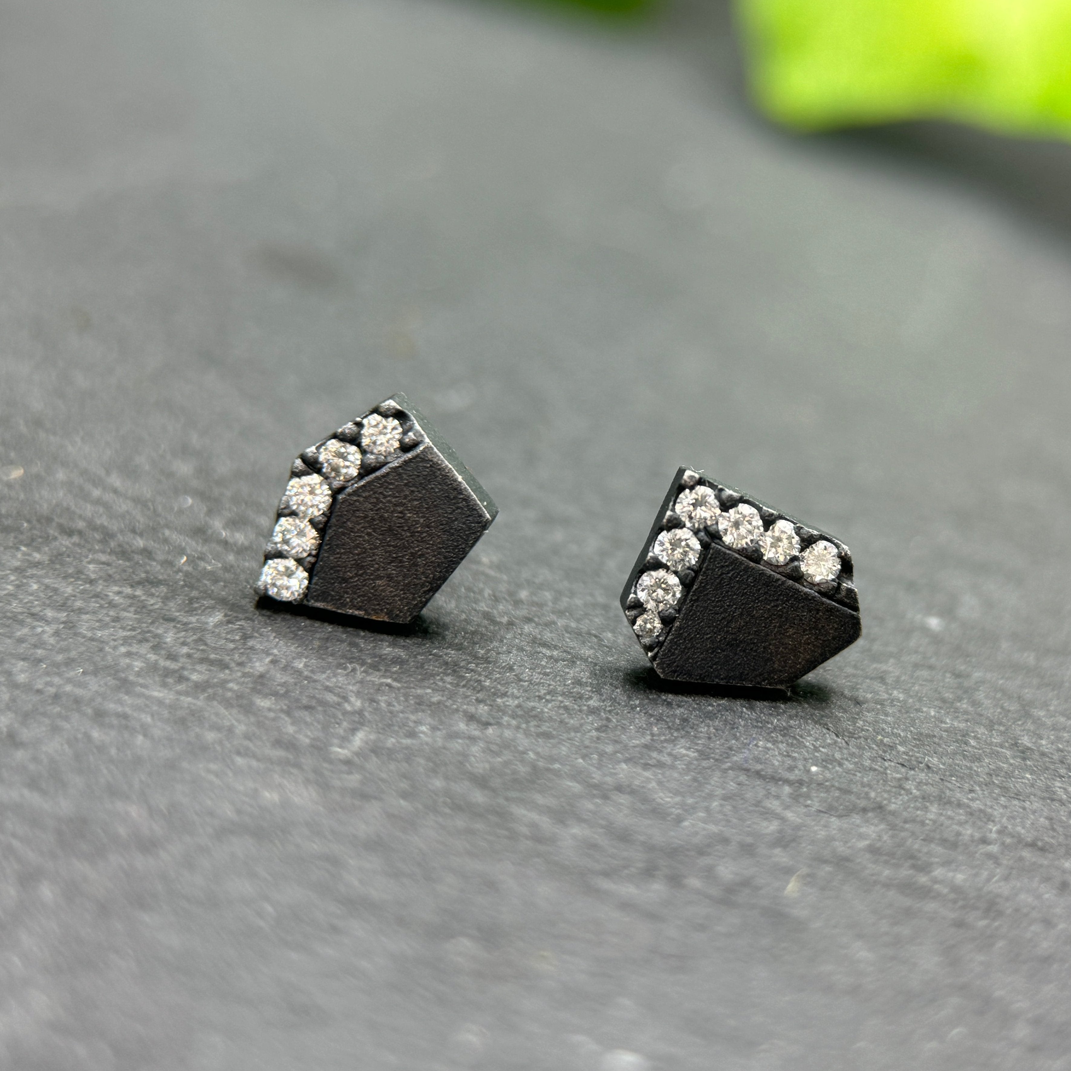 The cutest diamond studs that ever was! These oxidized silver, geometric studs measure approx 9mm wide and have hand cut white diamond pavé accents, .08ctw. Handmade in Denver, CO.