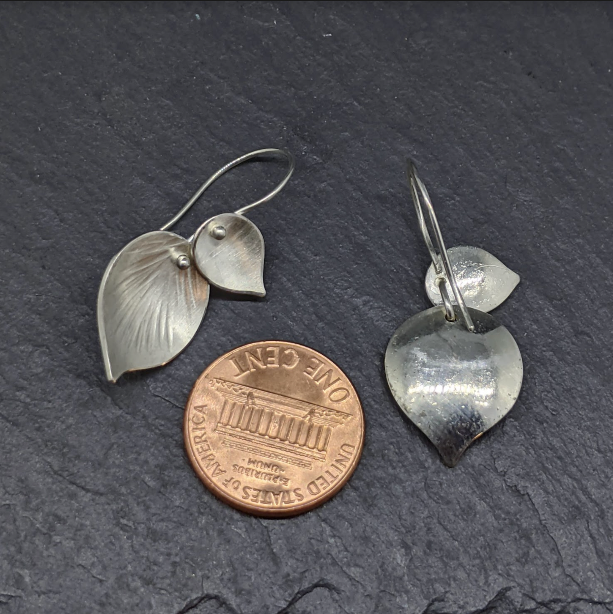 A pair of whimsical textured leaf earrings. Made from sterling silver, these earrings measure 1.25 inches in length.