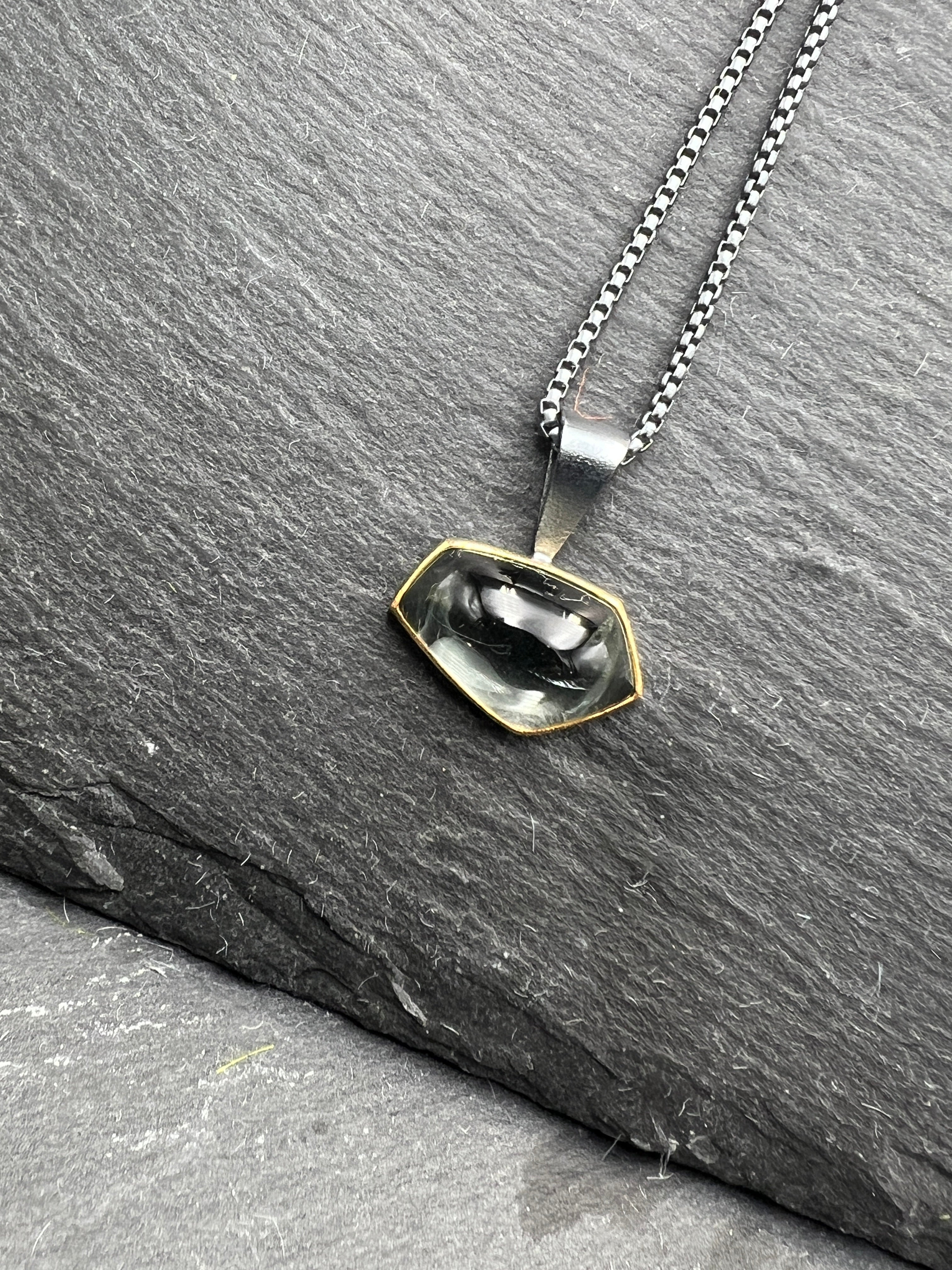 Transport yourself through the looking glass with this gorgeous prasiolite necklace. Bezeled in 22k yellow gold with an oxidized silver bail, this necklace hangs approximately an inch from the oxidized silver chain, which measures 16" in length.