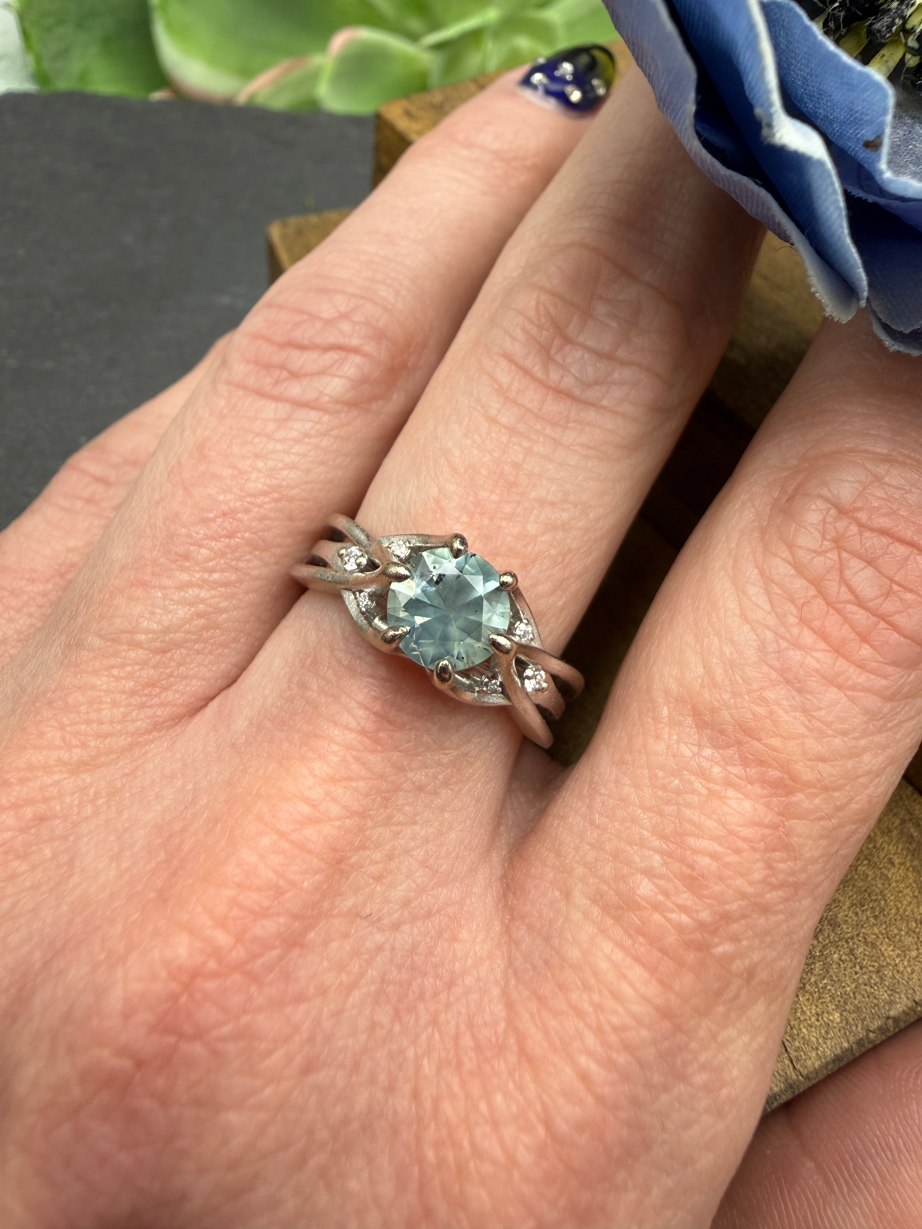 Metal: 14K palladium white gold Center Stone: 1.45ct Montana sapphire Accent Stones: .05ctw natural diamonds Size: 7, but sizeable
