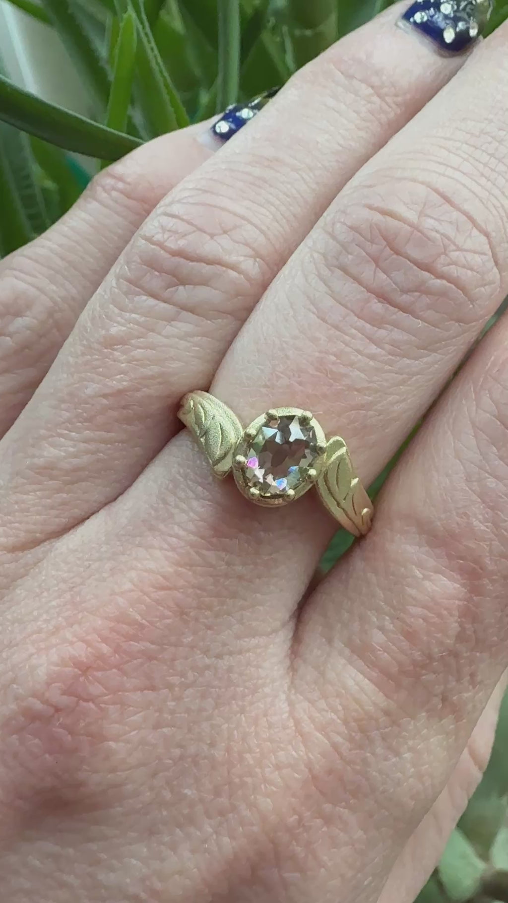 Late afternoon light through autumn leaves—that's the world Frond inhabits. A 1.12ct champagne Mughal diamond, an antique cut with decades of provenance, sits within a leaf-embellished band of warm yellow gold. The stone's natural warmth deepens against the golden setting, creating a ring that feels like golden hour made permanent. Graceful, aged, suffused with quiet warmth.