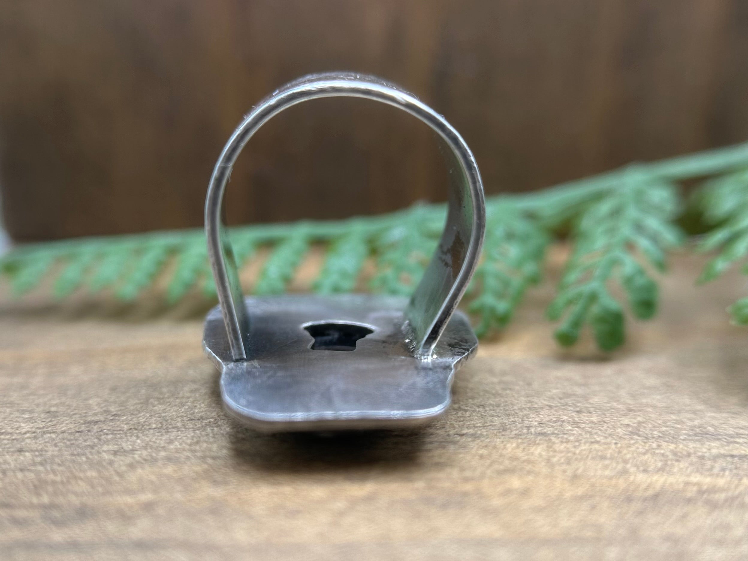 Encircling the carved stone, a hand-hammered radiating halo pattern creates texture and dimension, each deliberate line catching the light like sun rays breaking through clouds. The organic, slightly asymmetrical frame feels both ancient and modern, as though this talisman could have been unearthed from a sacred site or forged yesterday by skilled hands. Size 7.5.