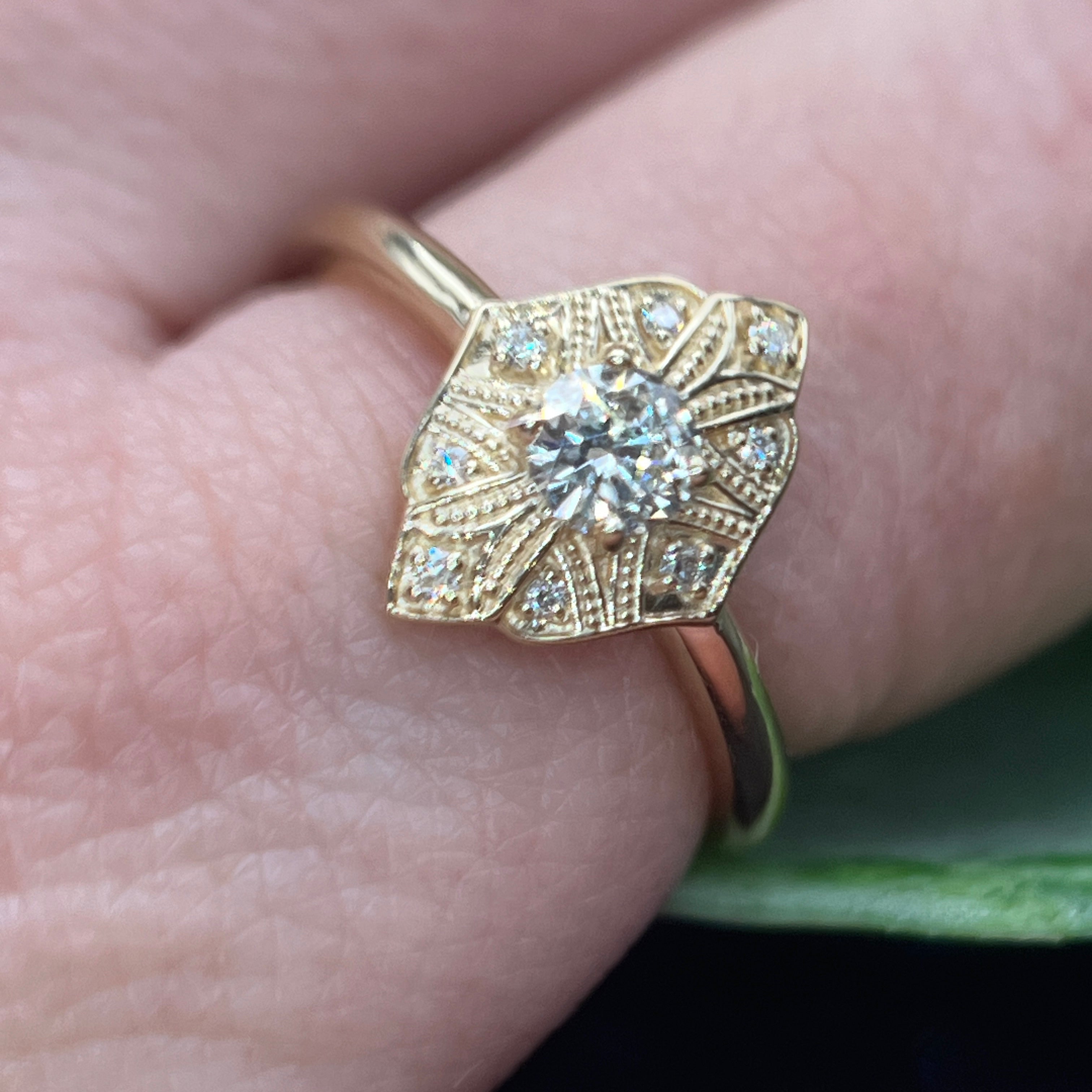 Reminiscent of deco designs, this 14k yellow gold ring marries old and new vibes. Set with natural reclaimed diamonds, the center diamond weighs 0.25ct, I-J, VS for color and clarity. Eight small round natural diamonds are scattered around the center diamond, weighing 0.05ctw, GH, SI1 for color and clarity. This ring is a size 6.75 and can be sized.