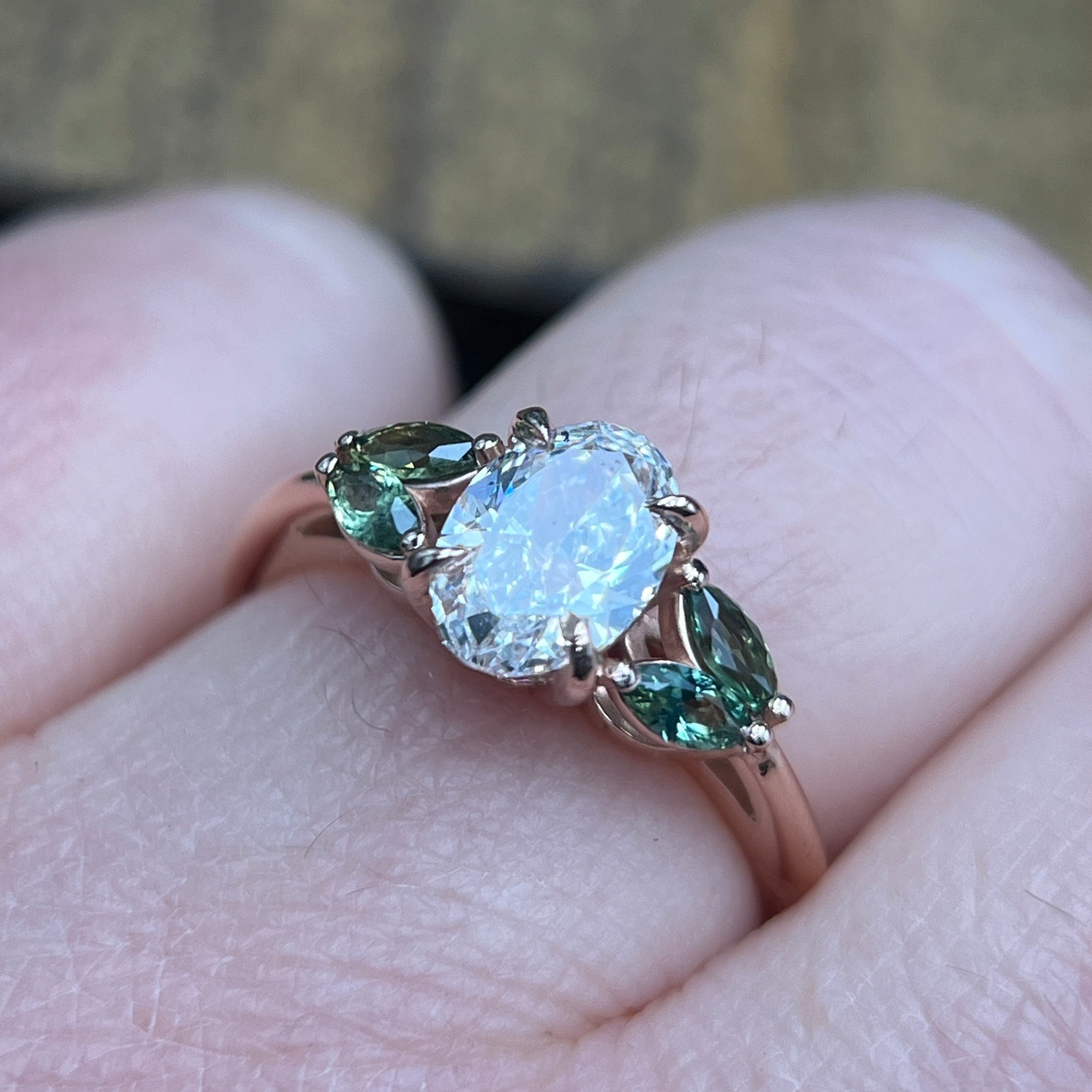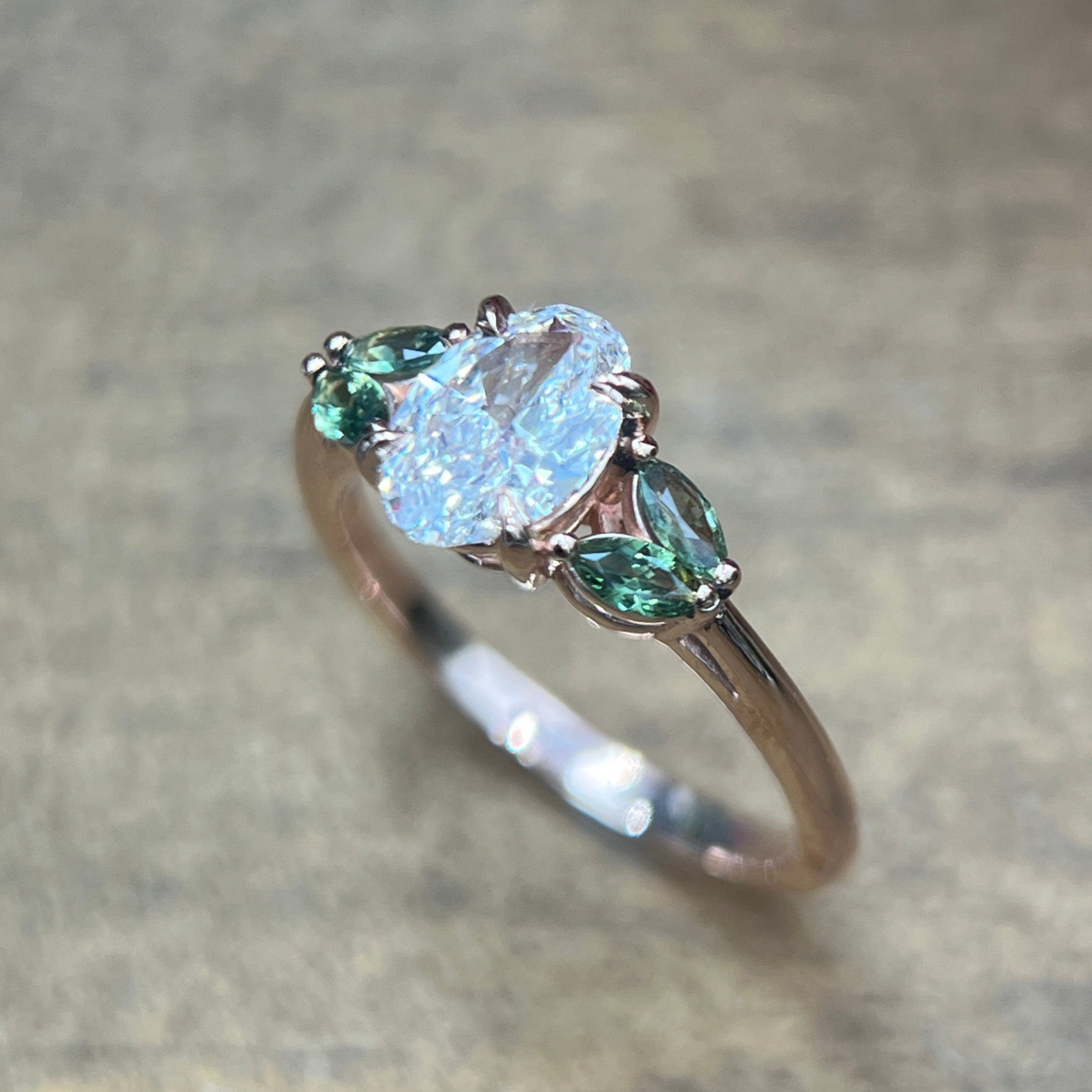 This elegant 14k rose gold ring contains a 1.03ct lab-grown oval diamond, FG VS1 clarity.  Flanking the center diamond are green marquise sapphires (.43ctw) with yellow and bluish tones depending on the light source.   This ring is a size 7 and is sizable.