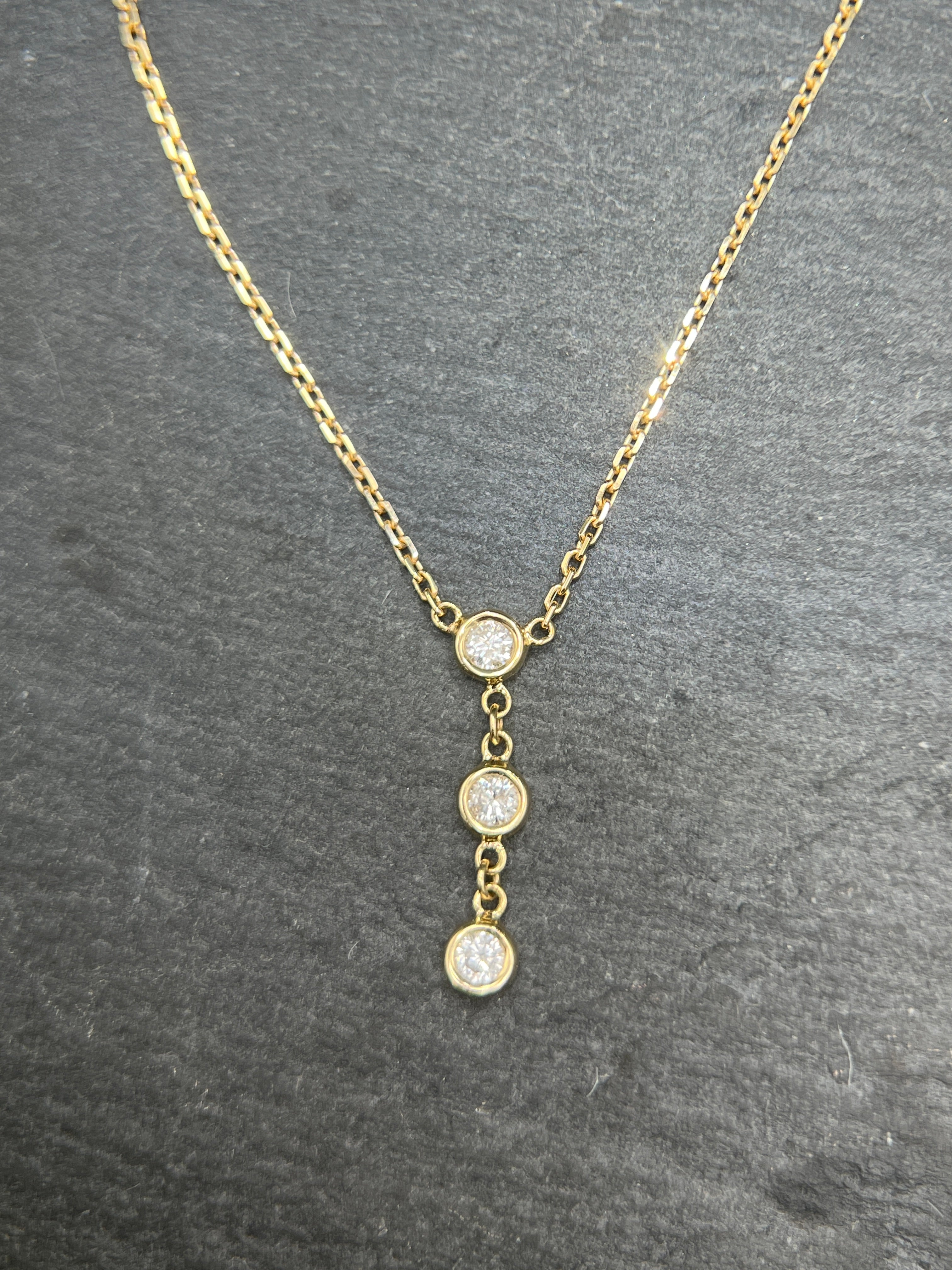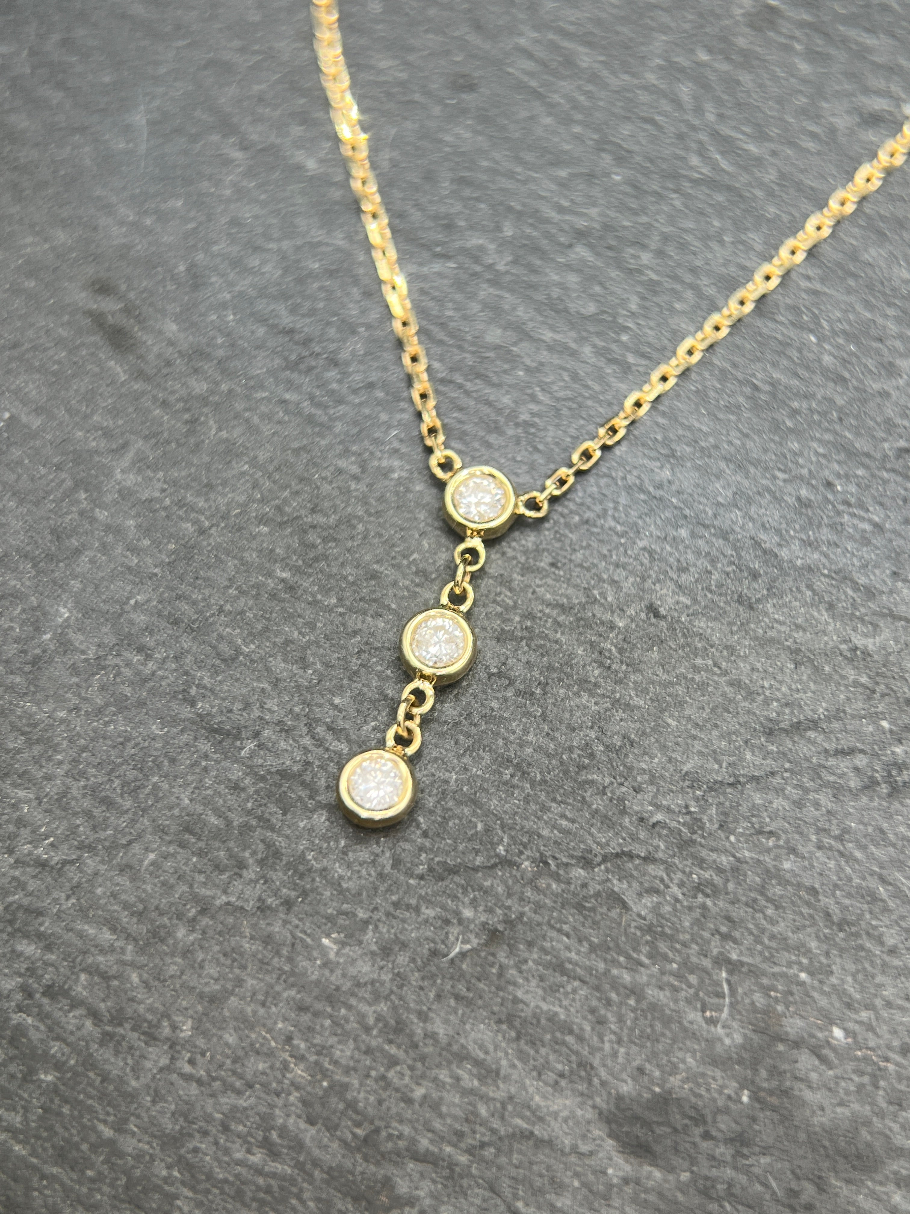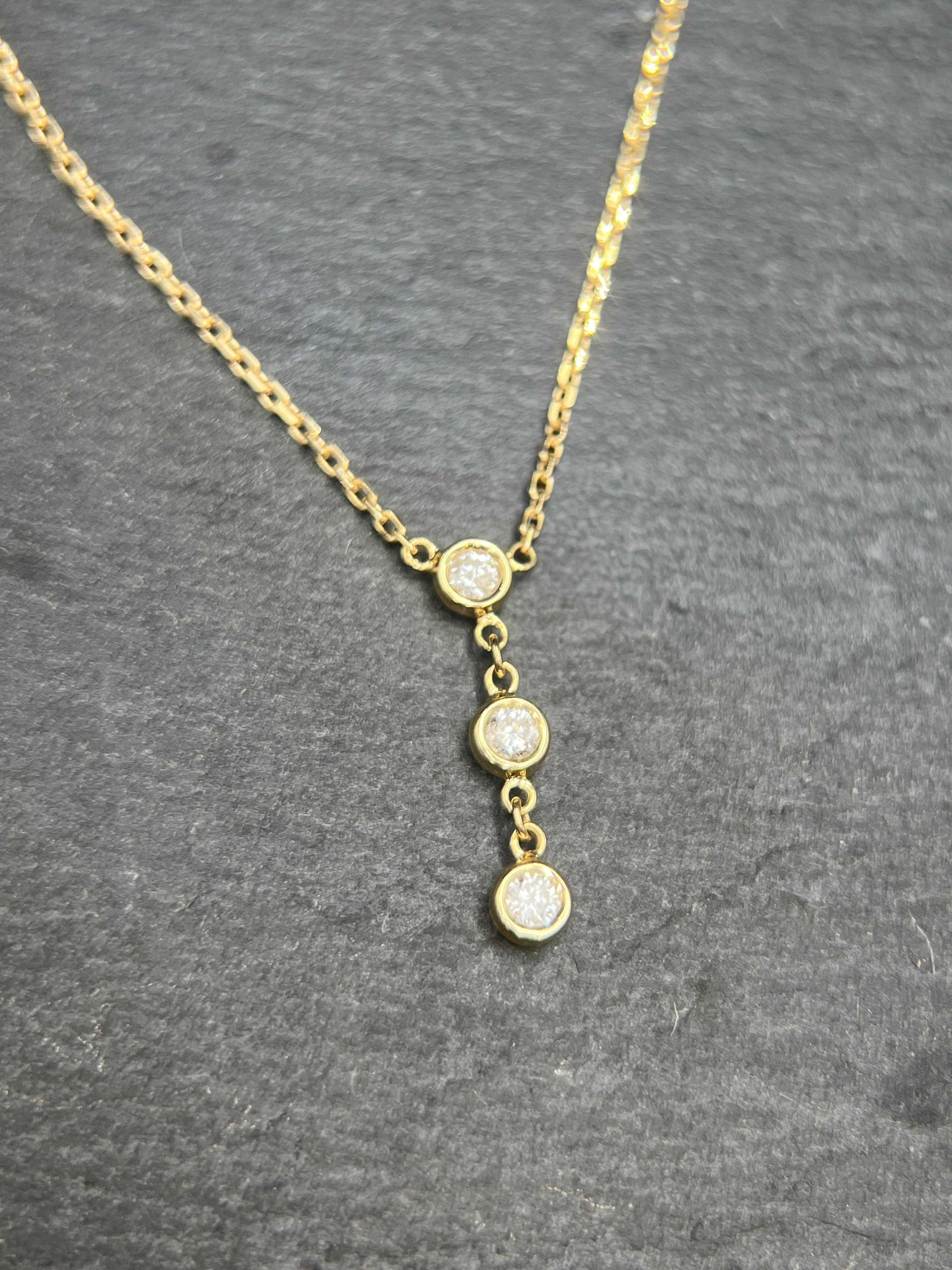 This 14k yellow gold necklace features three bezel set round lab diamond bezels, connected vertically for a lariat style necklace. The diamonds weigh .21ctw and dangle off the 14ky diamond cut 15.5" cable chain, approximately 3/4".