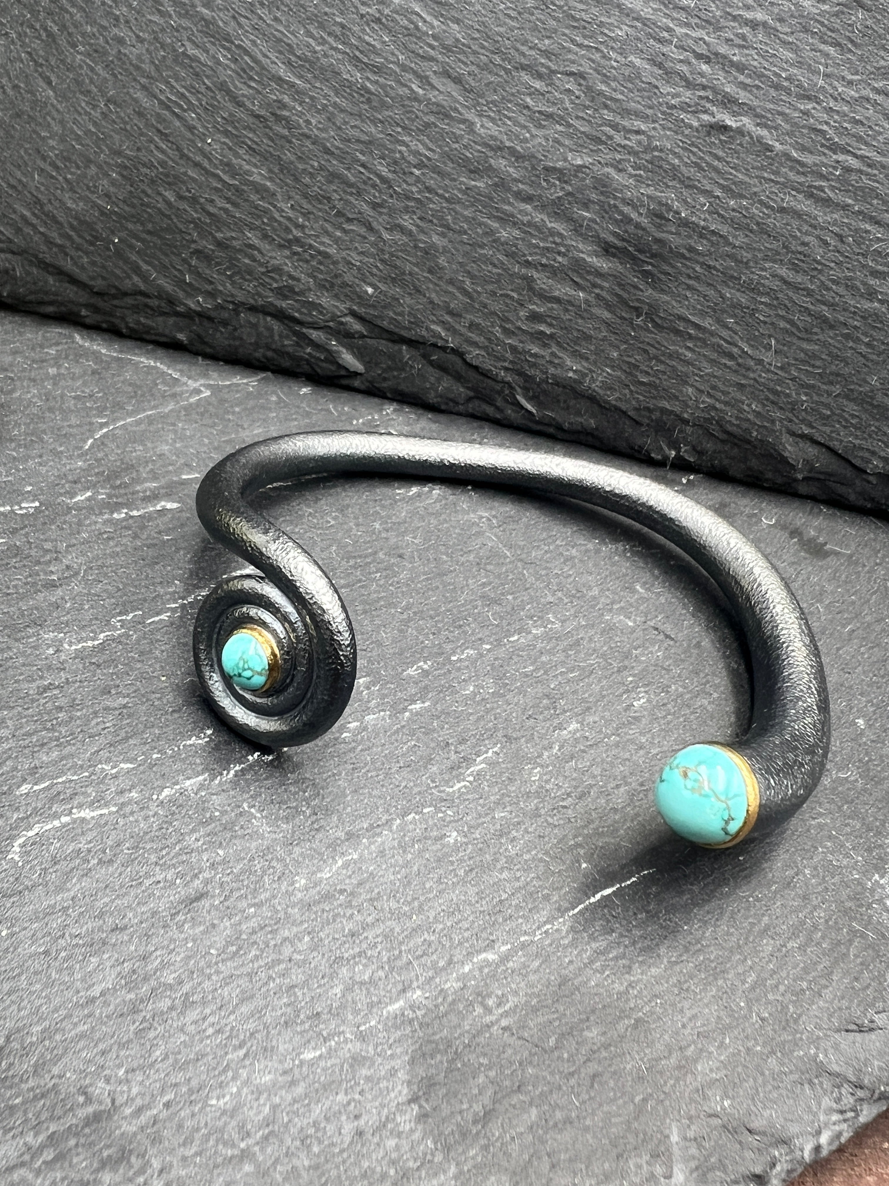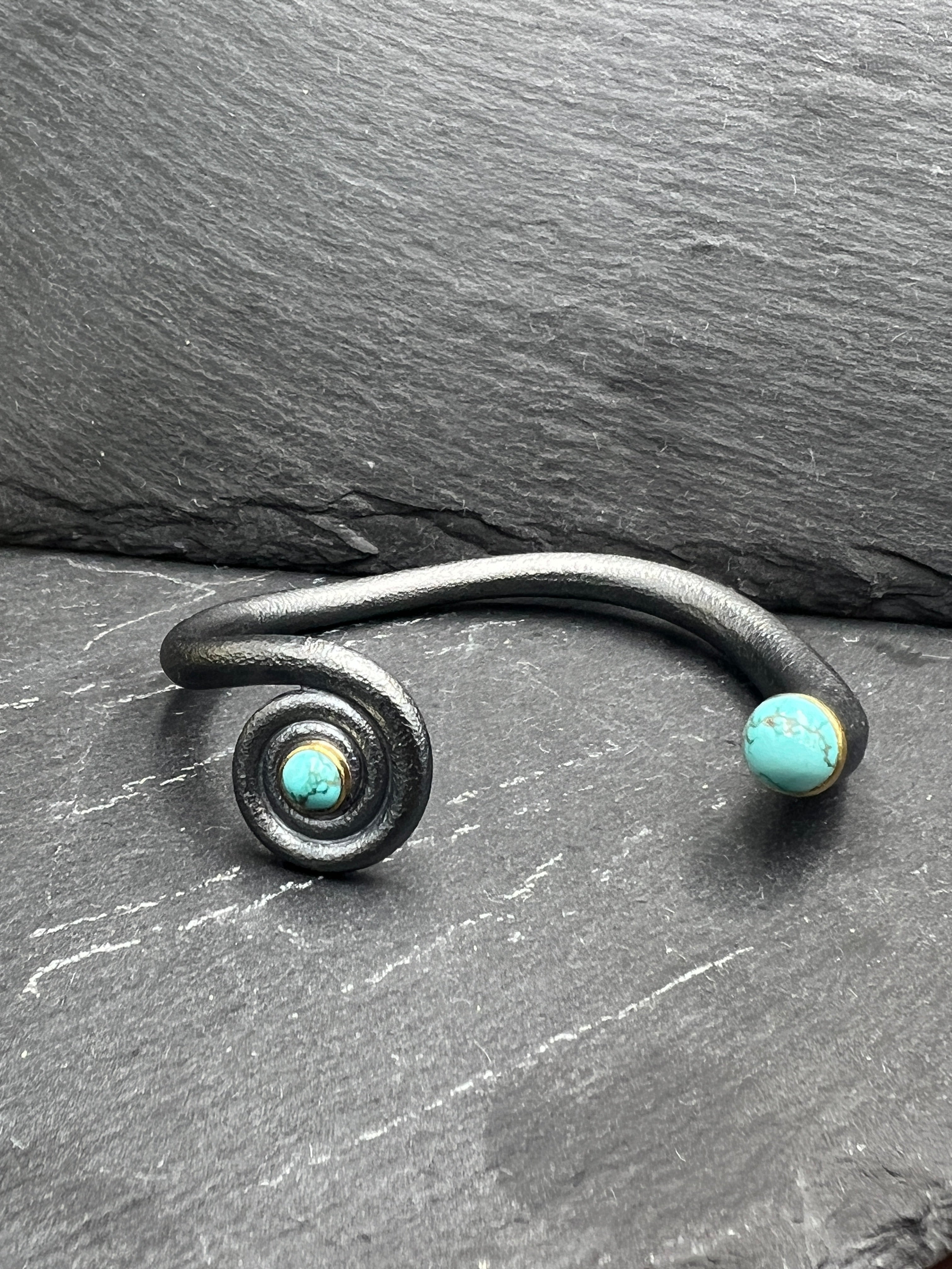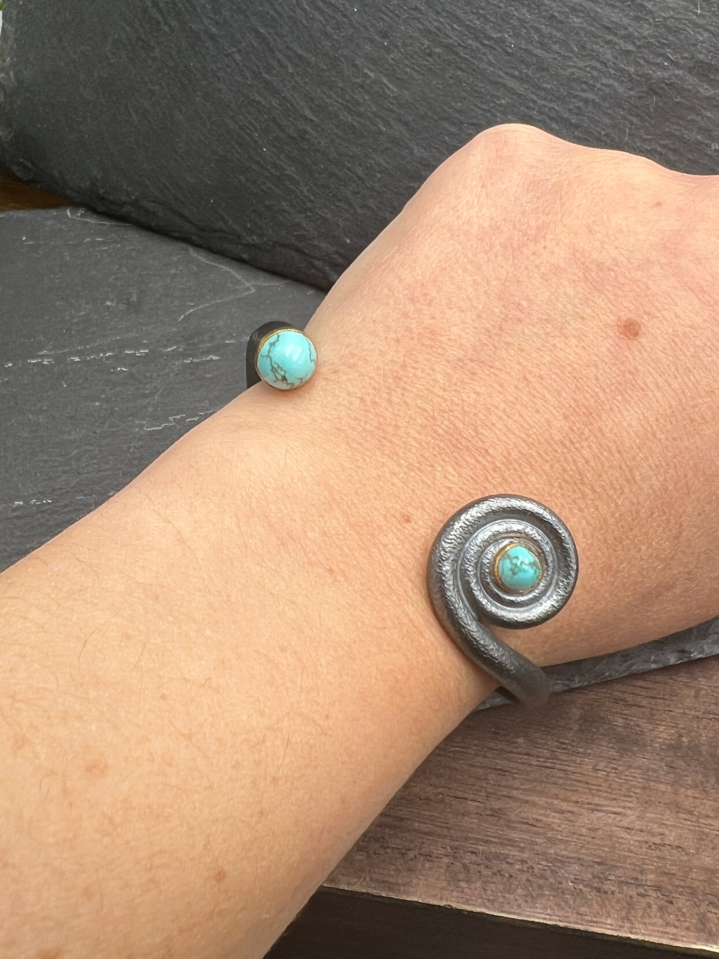 This beautiful piece of metalwork features an oxidized fine silver cuff, that wraps up into a mesmerizing spiral on one side. Both ends of the bracelet feature a piece of Kingman Mine Turquoise, bezeled in 22k yellow gold.