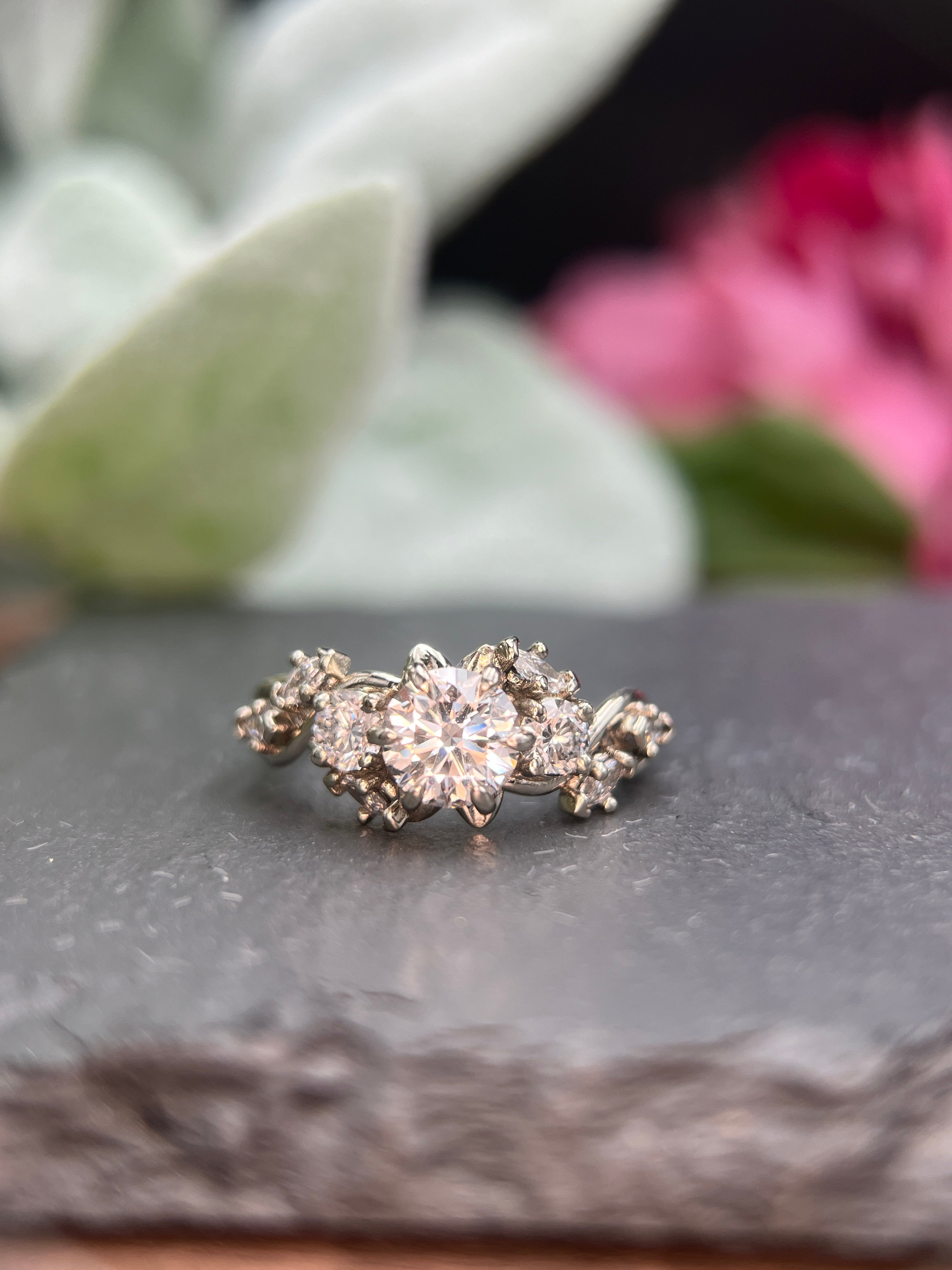 Made in 14K white gold, this intricate ring features a leaf and vine pattern accentuated by lab marquises (.39ctw) and rounds(.50ctw), and a brilliant cut, 1.25ct round lab diamond center. You'll be mesmerized by the sparkle on this beautiful, enchanting ring!