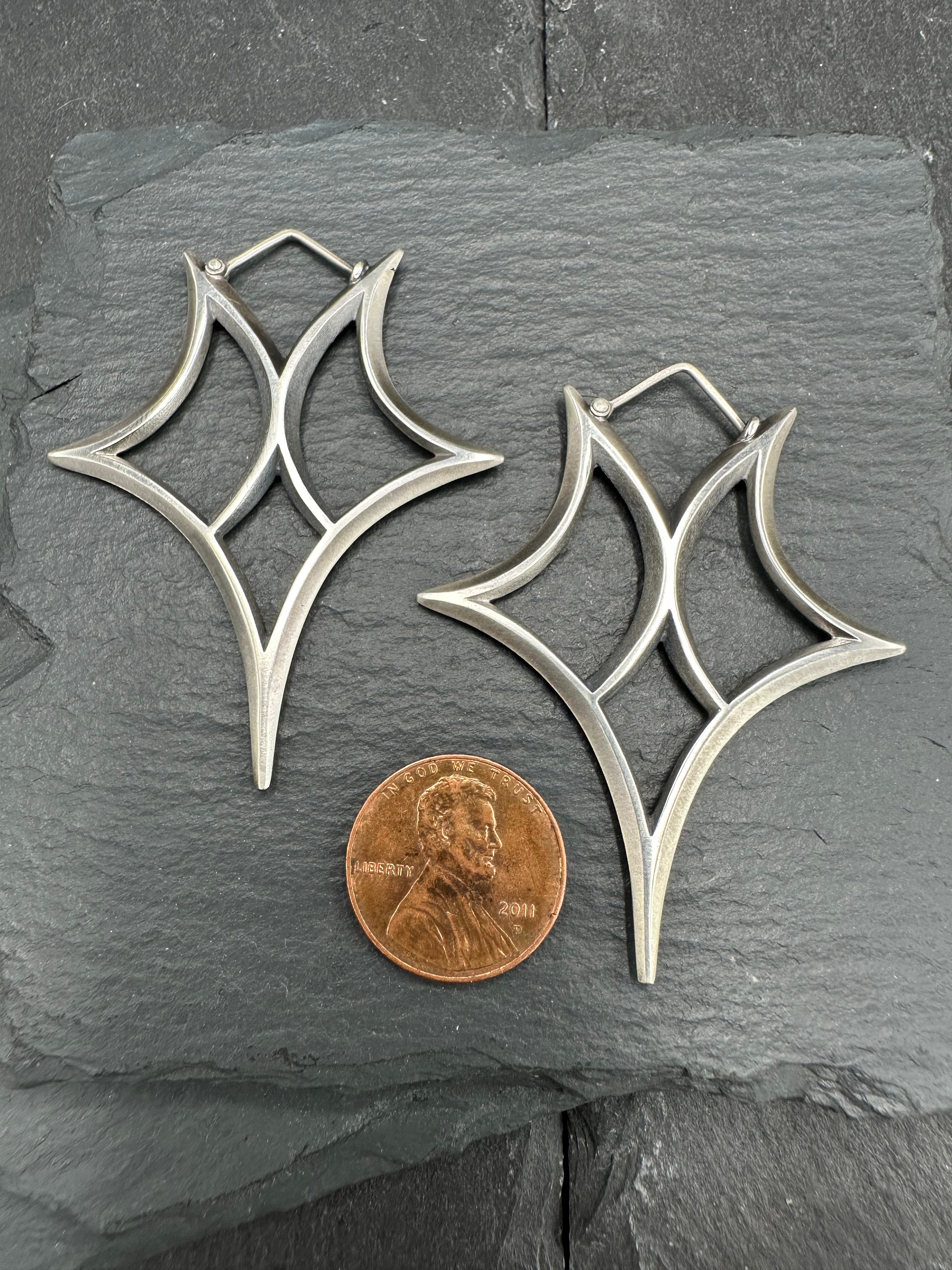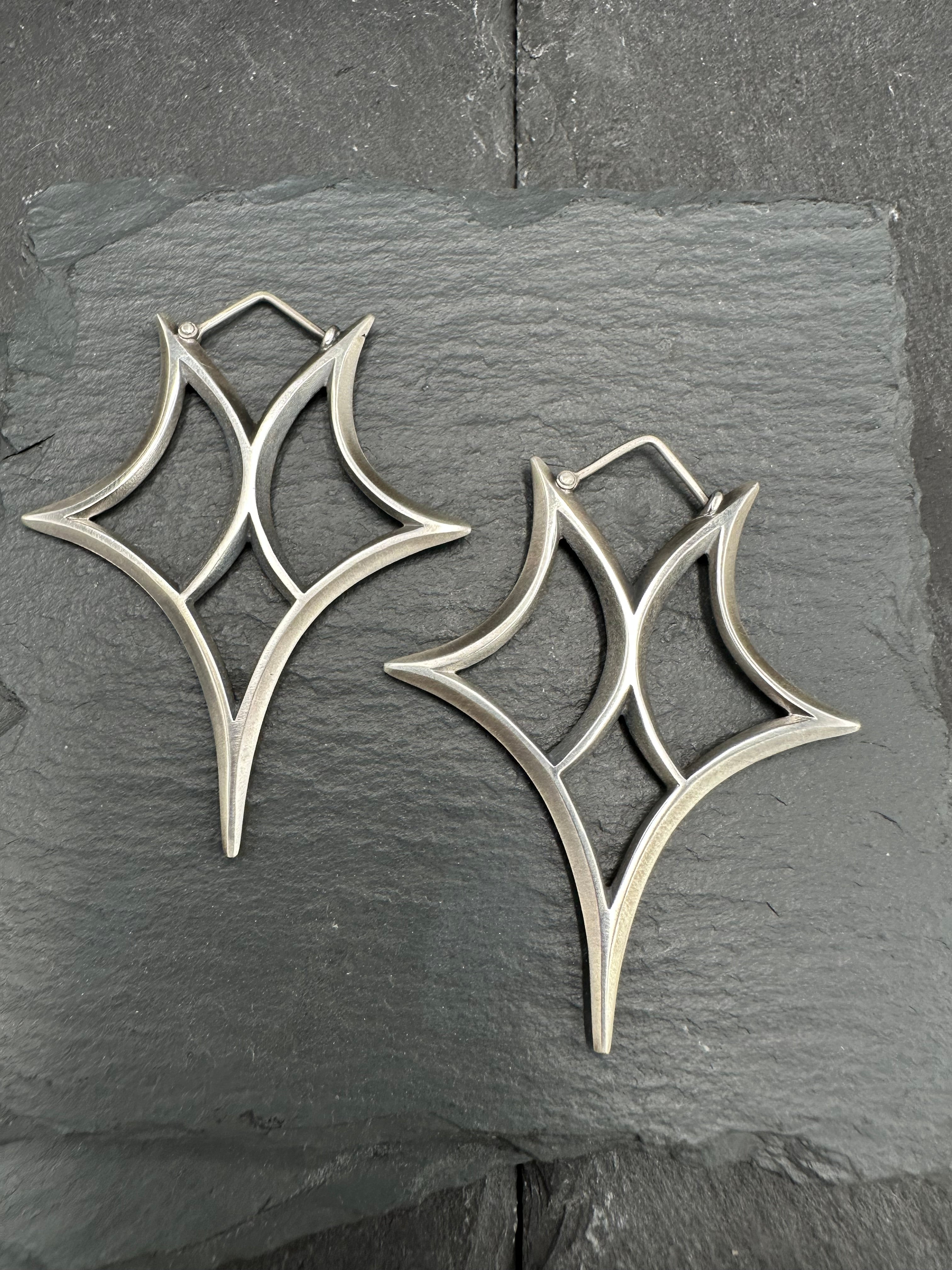 Hand carved and cast in sterling silver with a lightly oxidized finish and polished details, these gothic inspired earrings are sure to make a statement. They have a hinged closure and measure 2-1/4" x 1-3/4".