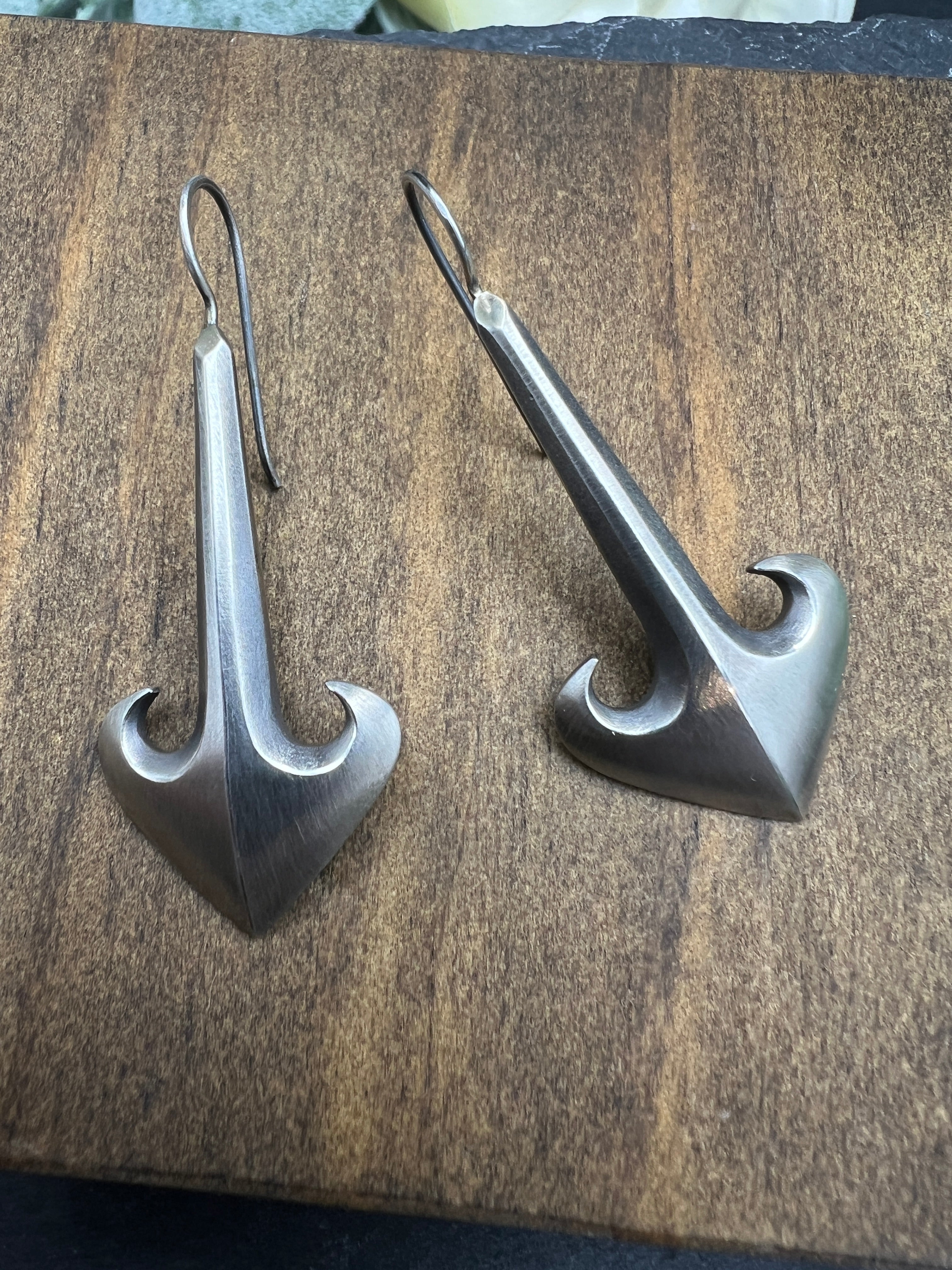 Hand carved and cast in sterling silver, these heart shaped dangles are both elegant and edgy. They have sterling silver ear wires and measure just over 2" long x 1" at its widest point.