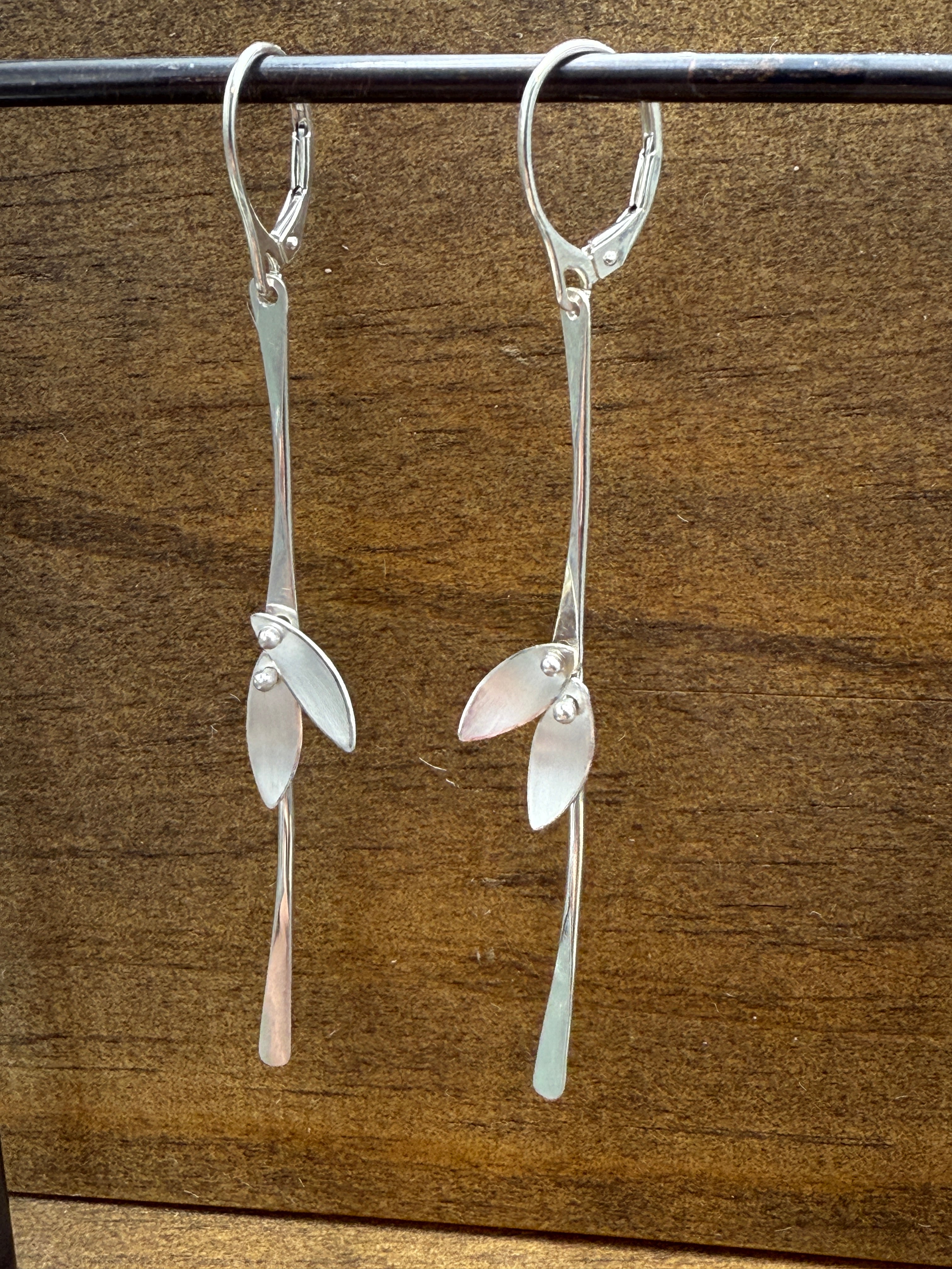 Feather light and dangly! Satin finished silver leaves dangle against sterling silver branches. Hinged connections provide extra movement and sparkle! 2 1/2 inches long.