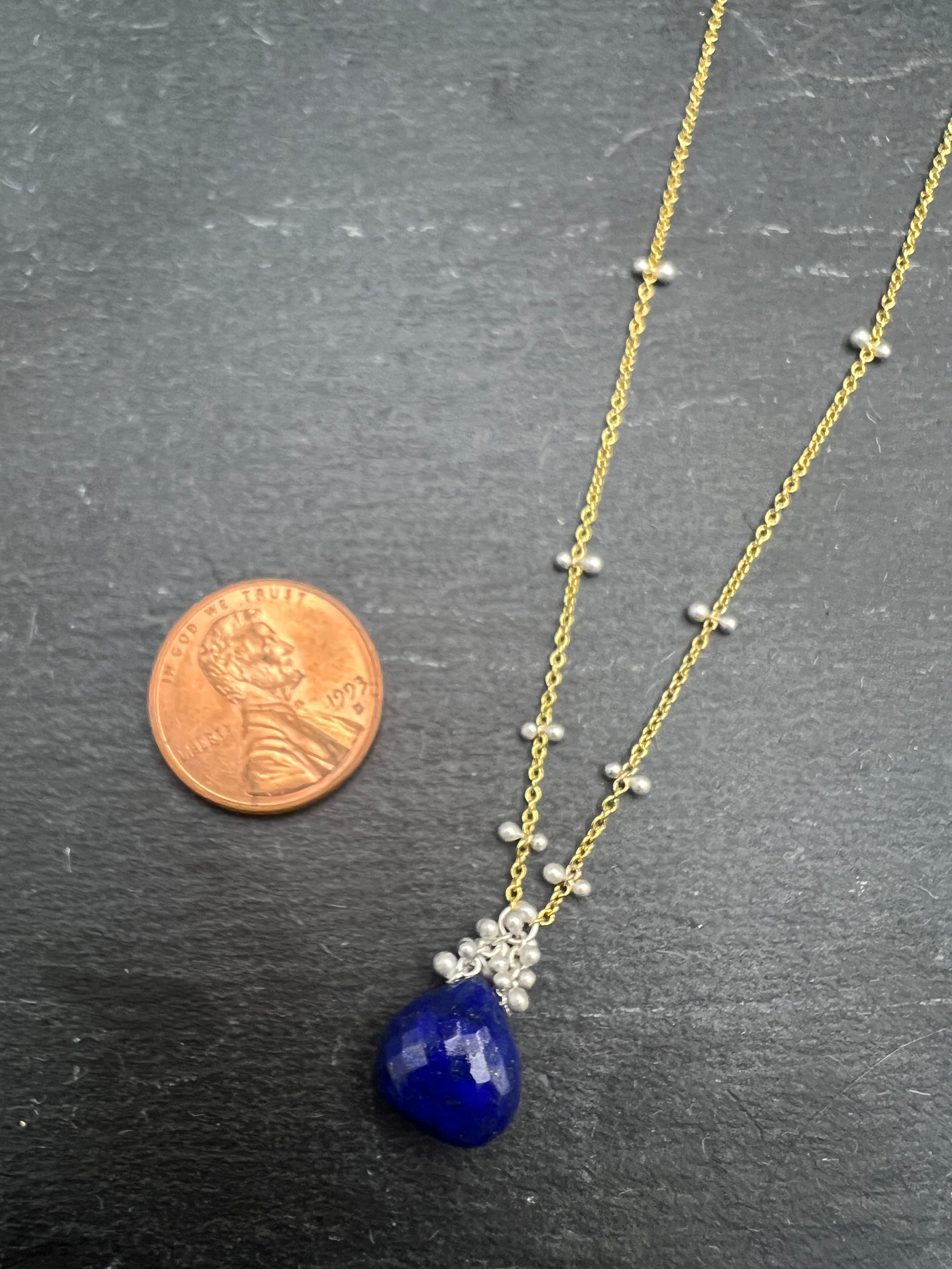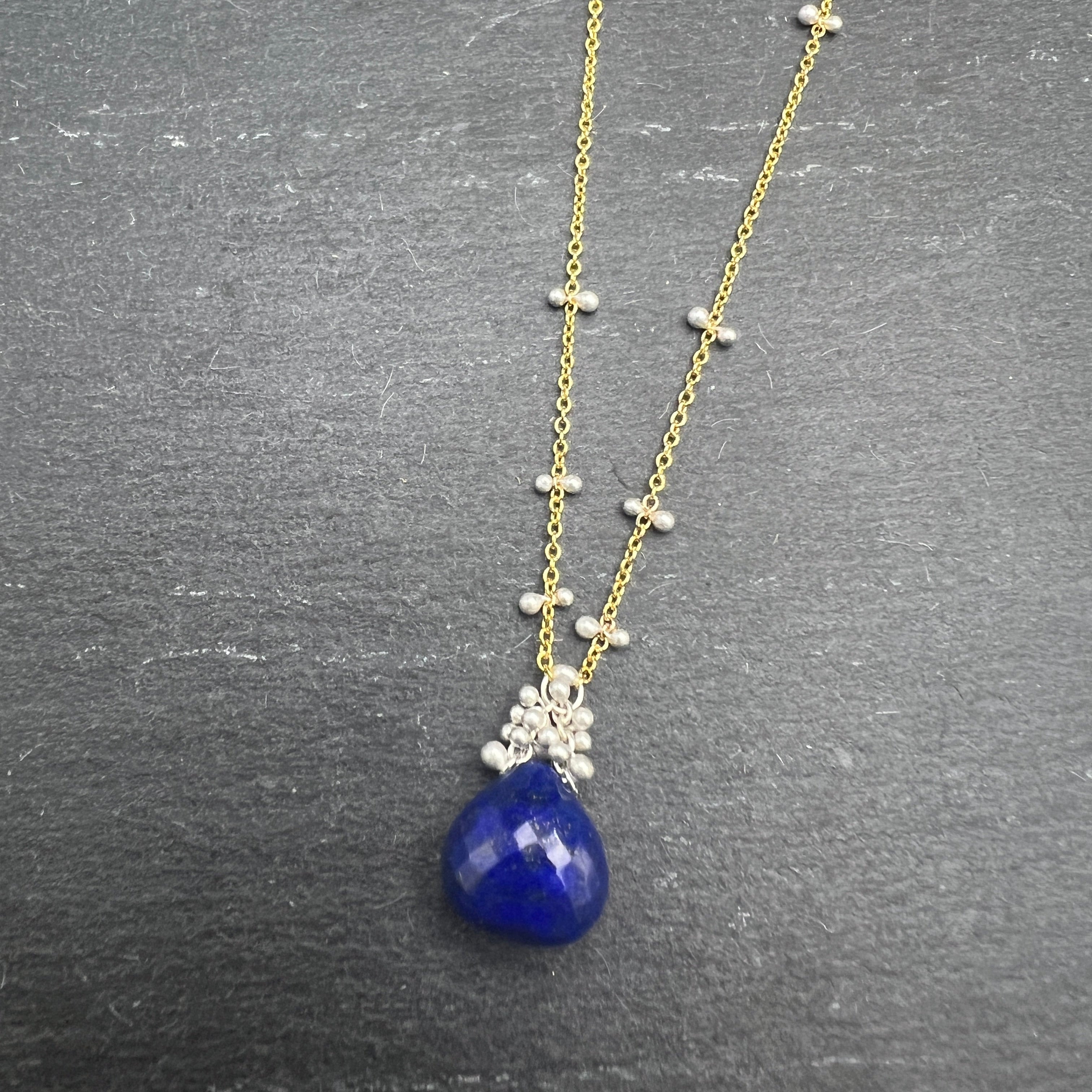 A beautiful lapis droplet hangs from a simple gold-fill chain, complete with Yedomi's signature sterling silver 'caviar' and handmade silver chain accents.