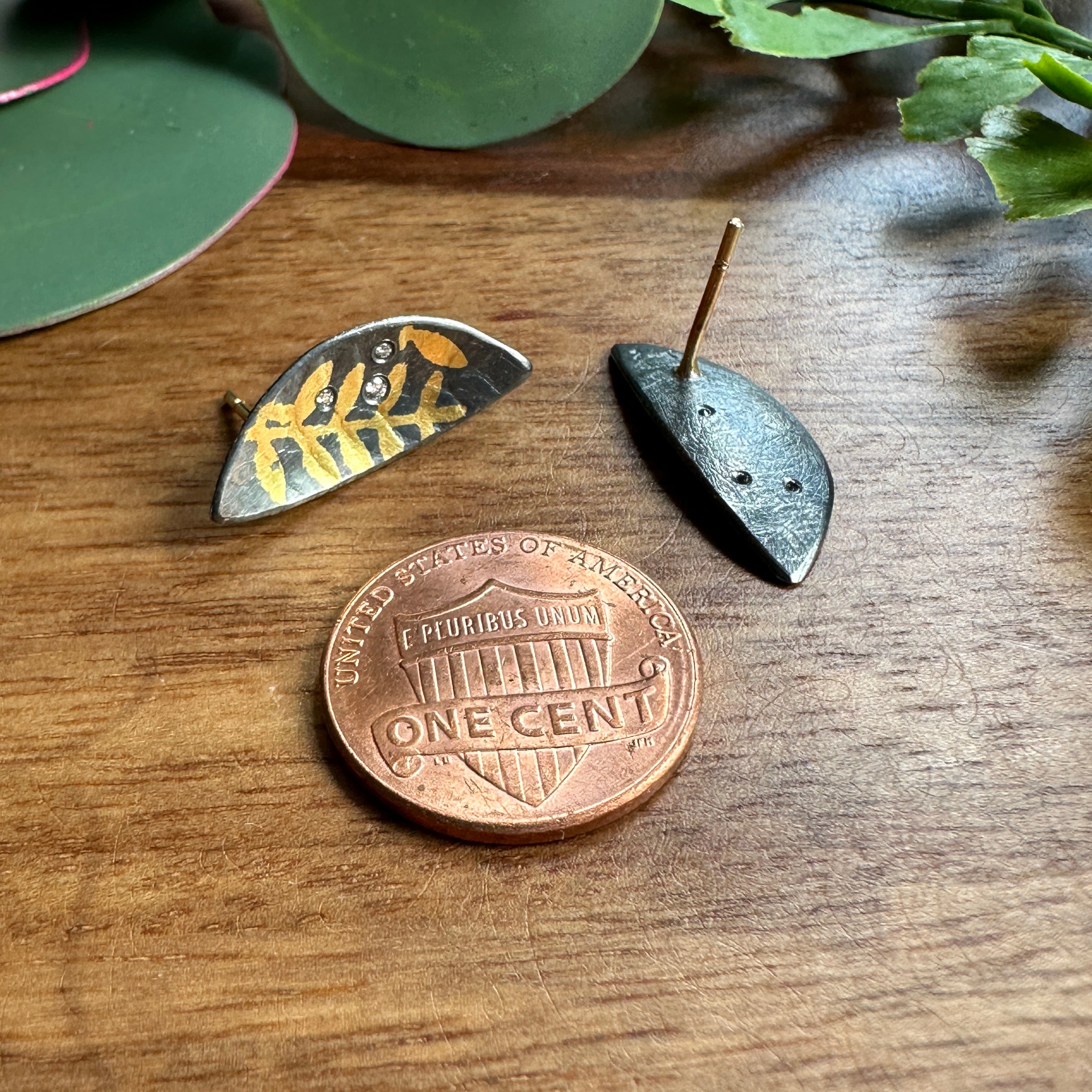 These uniquely shaped post earrings are made in oxidized sterling silver with 24k yellow gold keum boo leaf motifs fused onto it, with 3 small diamonds on each earring (.03ctw).