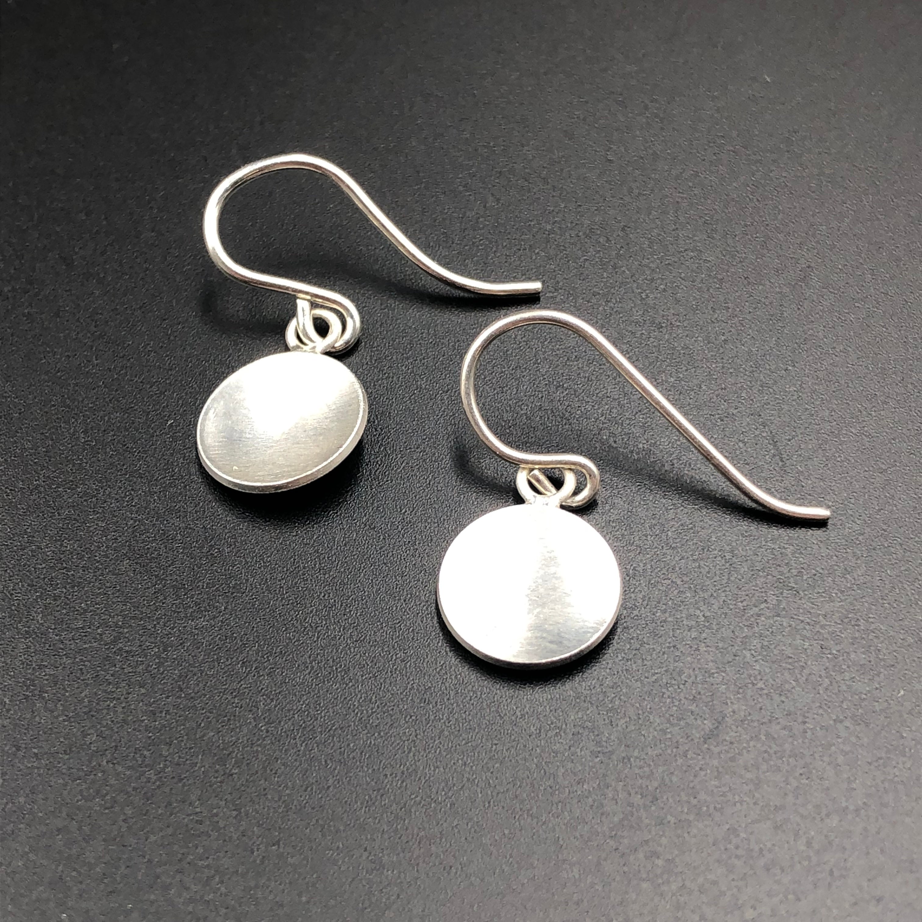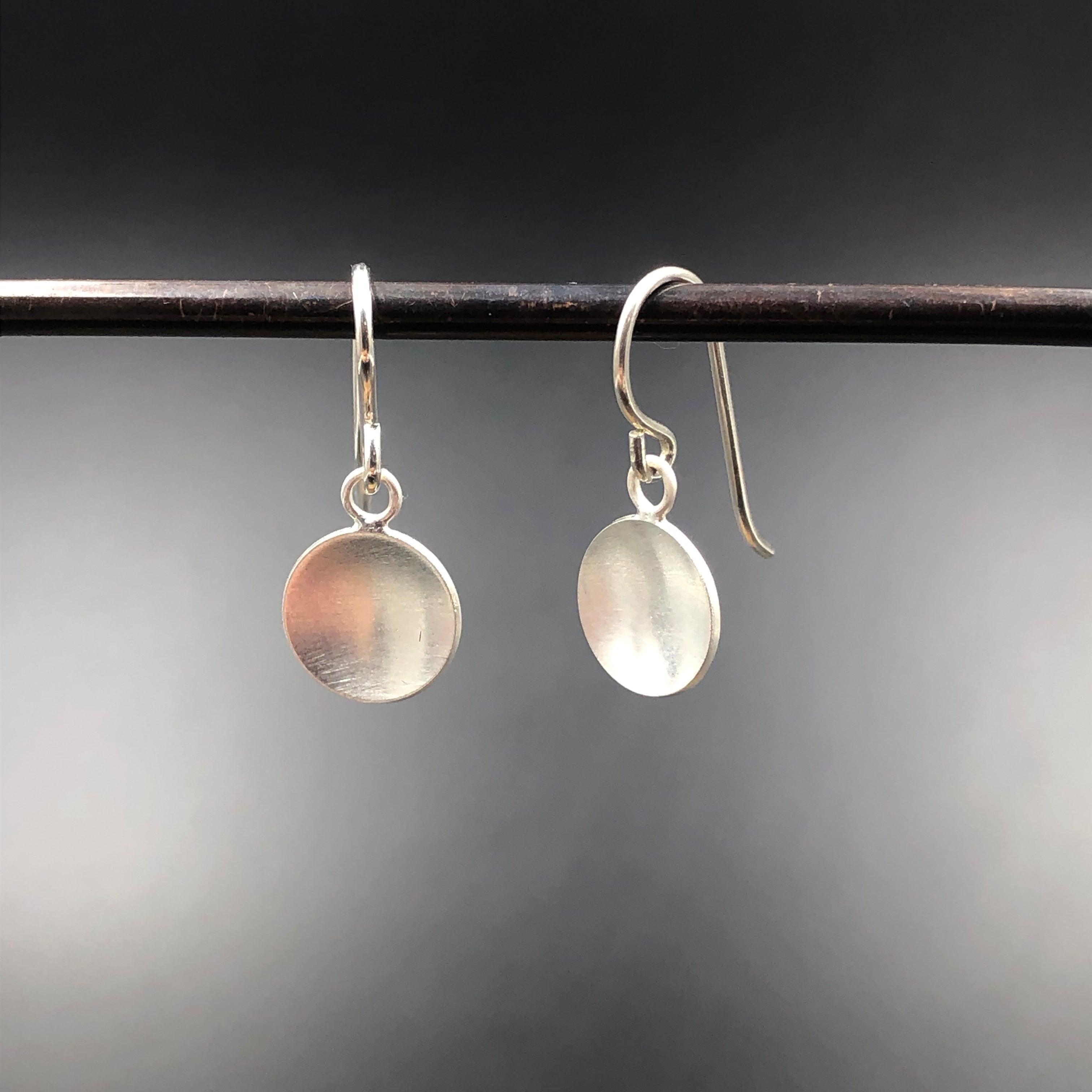 A single sterling silver domed disc hangs on a sterling silver earwire. These earrings are 3/4 inch in length and are handmade in Denver, CO, USA
