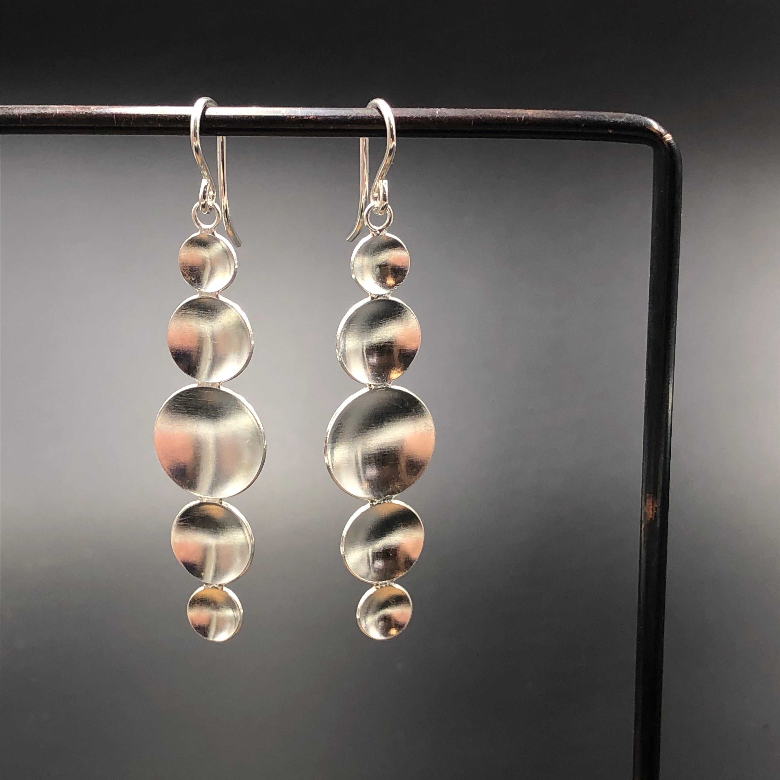 Five sterling silver domed discs hang on sterling silver earwires. These earrings are 2.25 inches in length and are handmade in Denver, CO, USA
