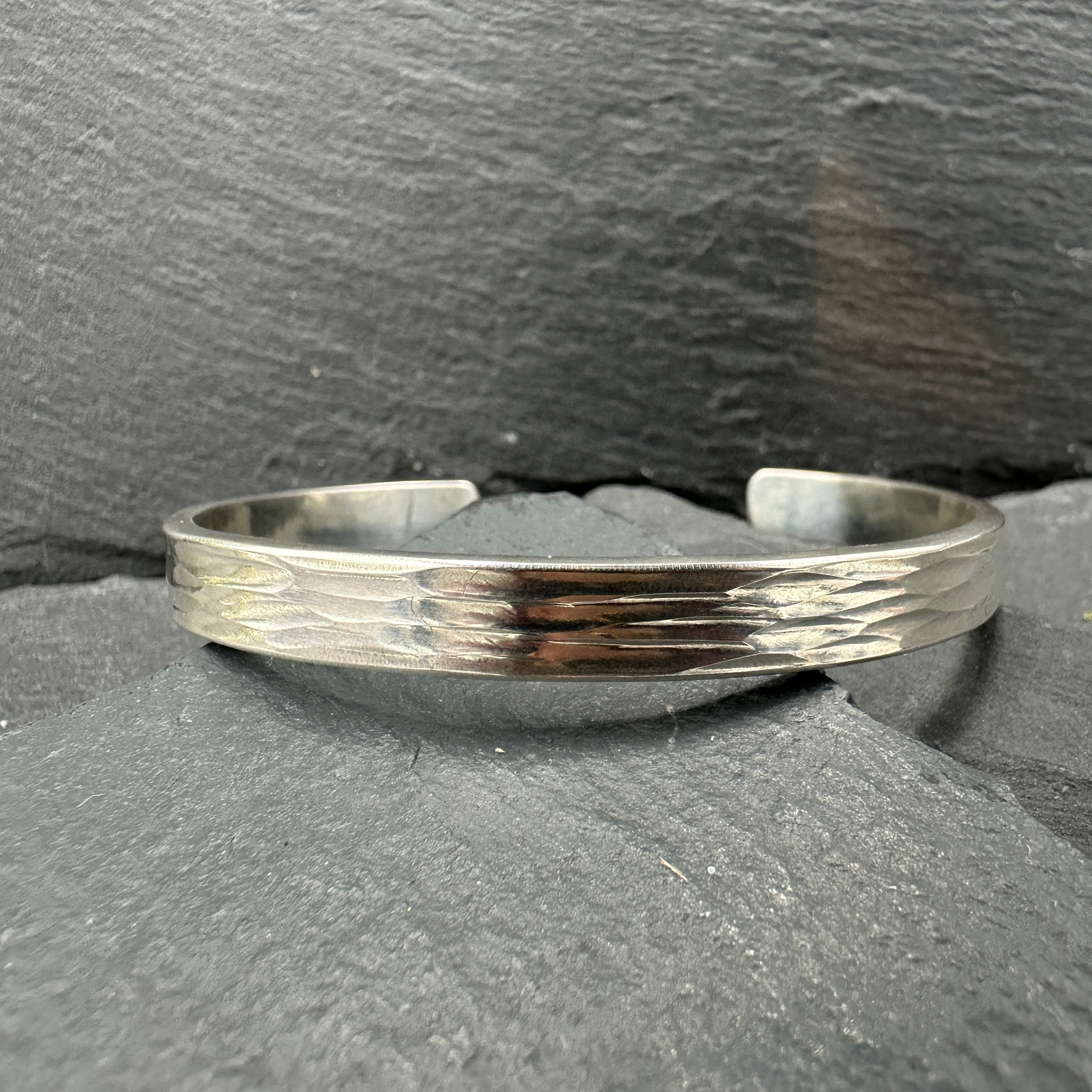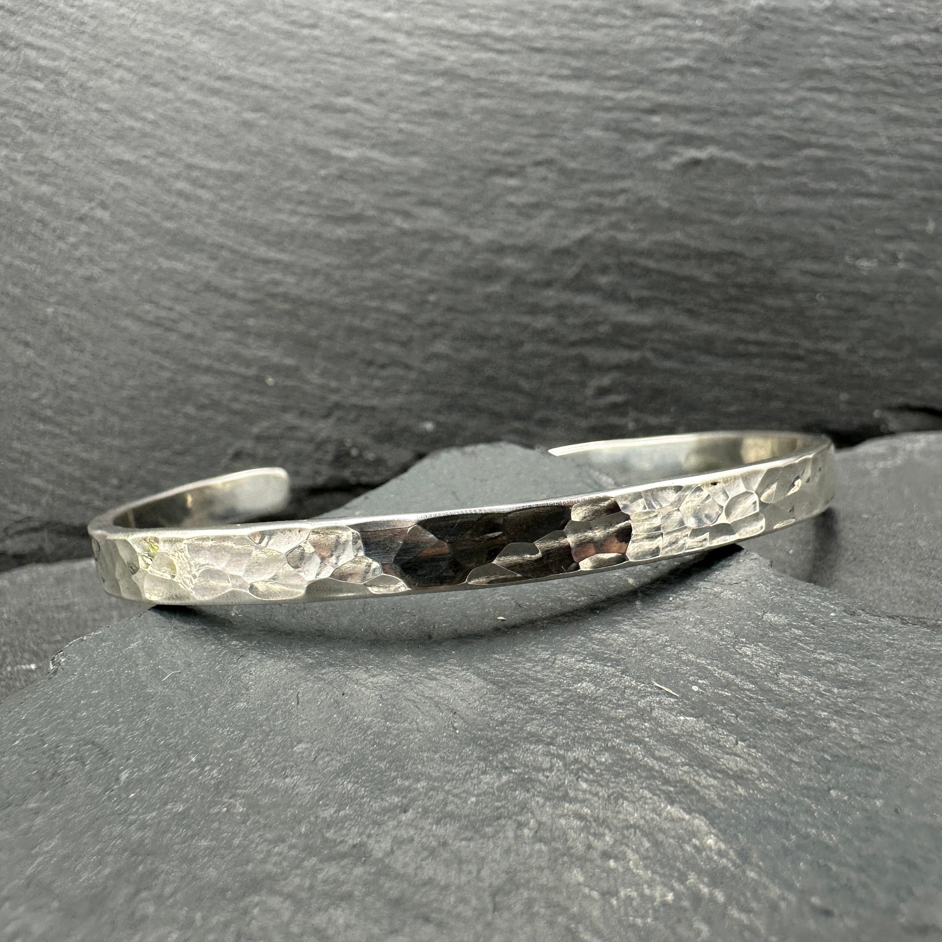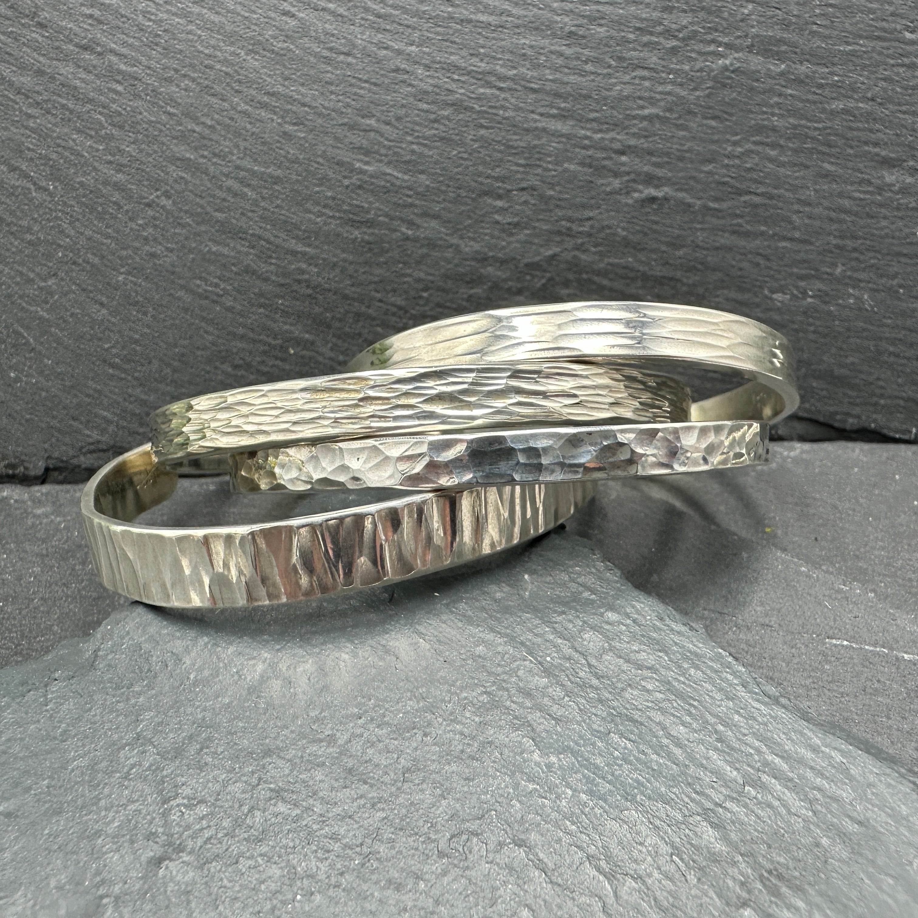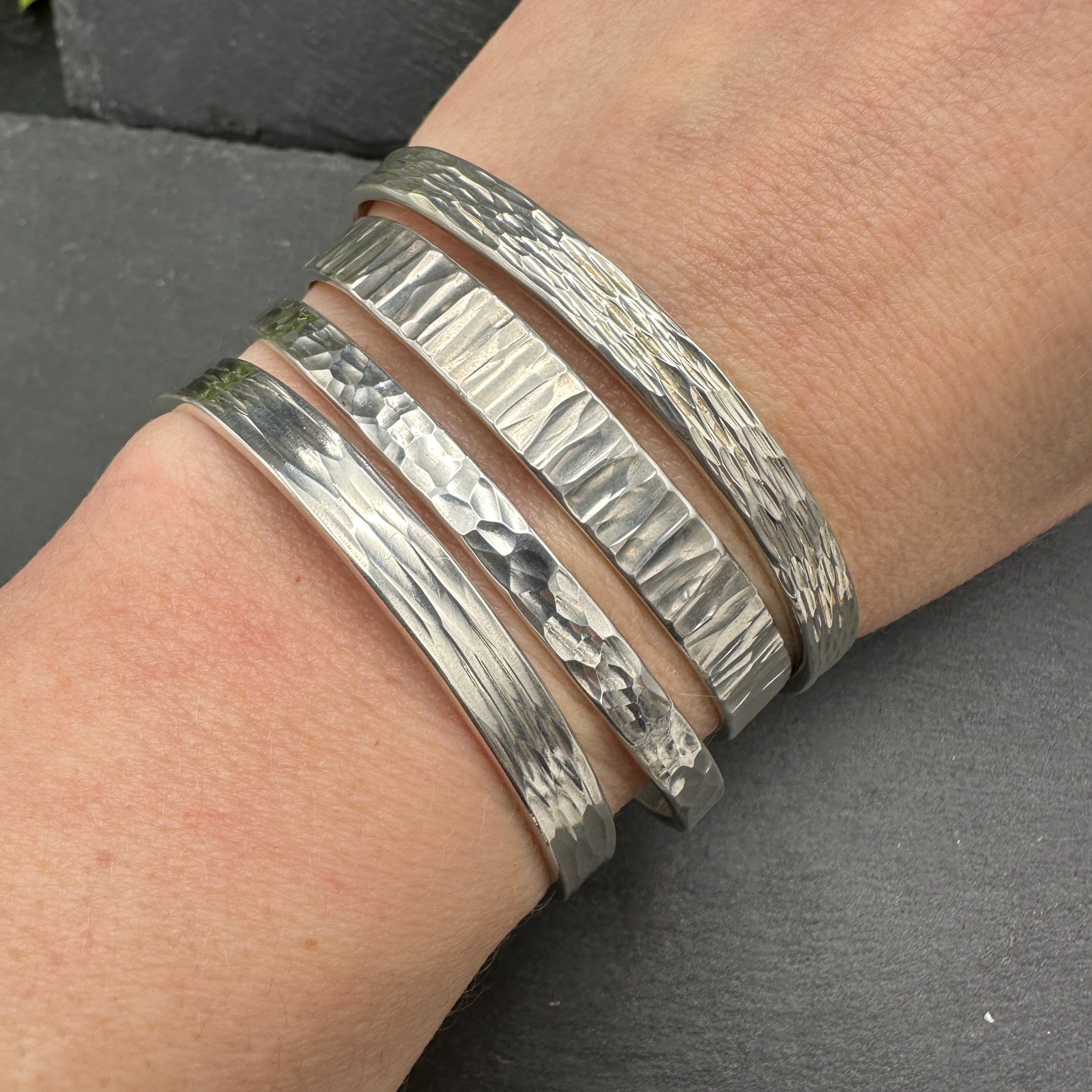 Hammered sterling silver cuff bracelet in varying patterns.