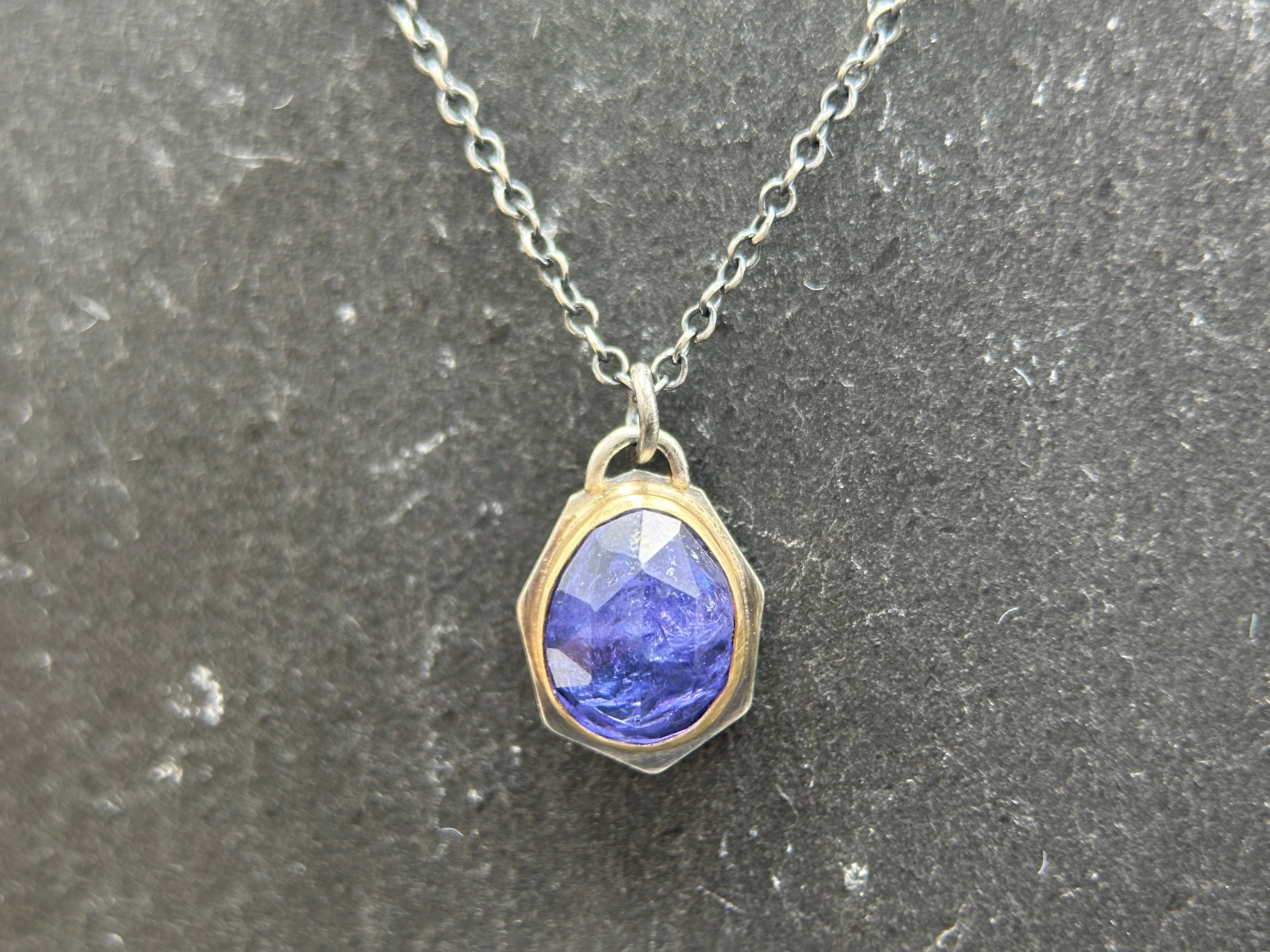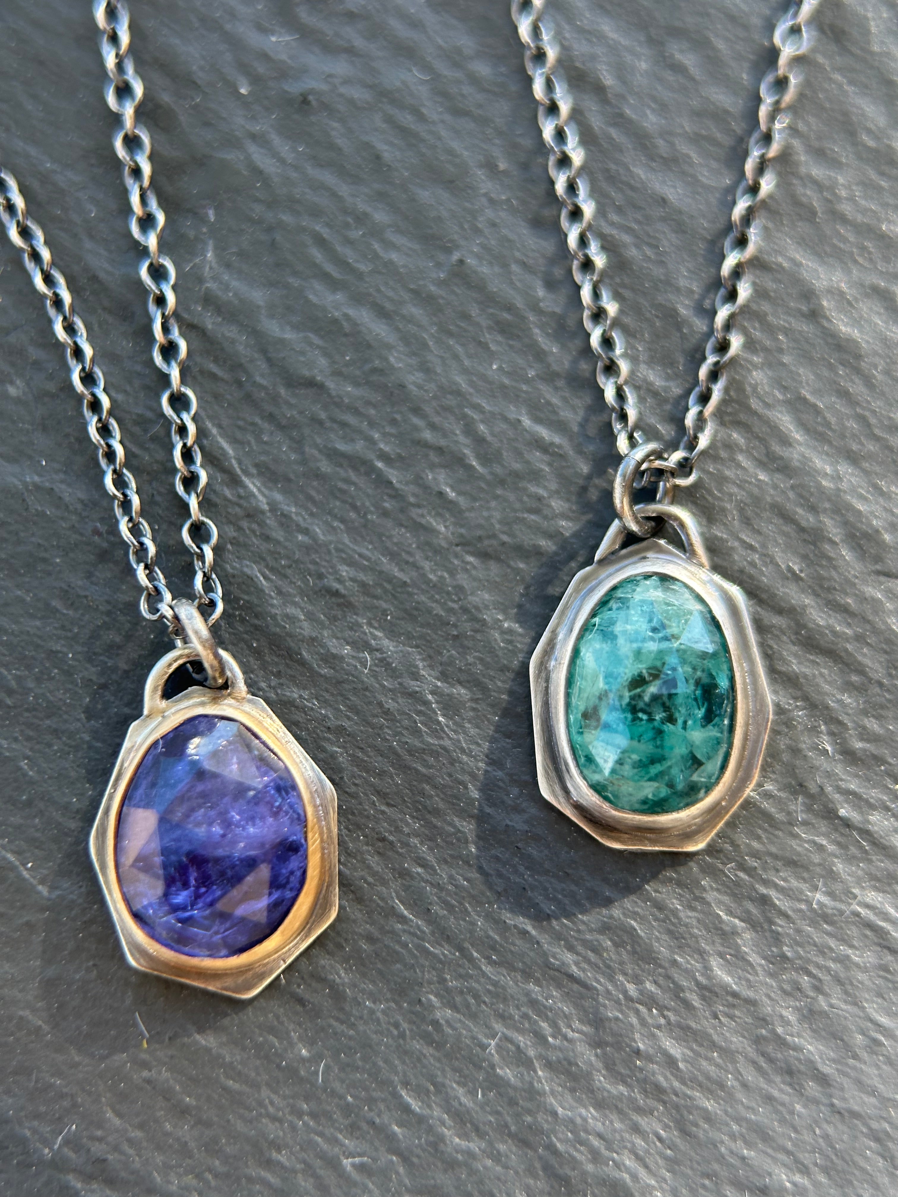 Rose-cut gems are elegantly bezel-set in sterling silver asymmetrical "windows" on these beautiful necklaces. The necklaces dangle like charms from oxidized 18" cable chains, which can be swapped out for different lengths or styles (please note that some alternative chains may incur a slight price increase).