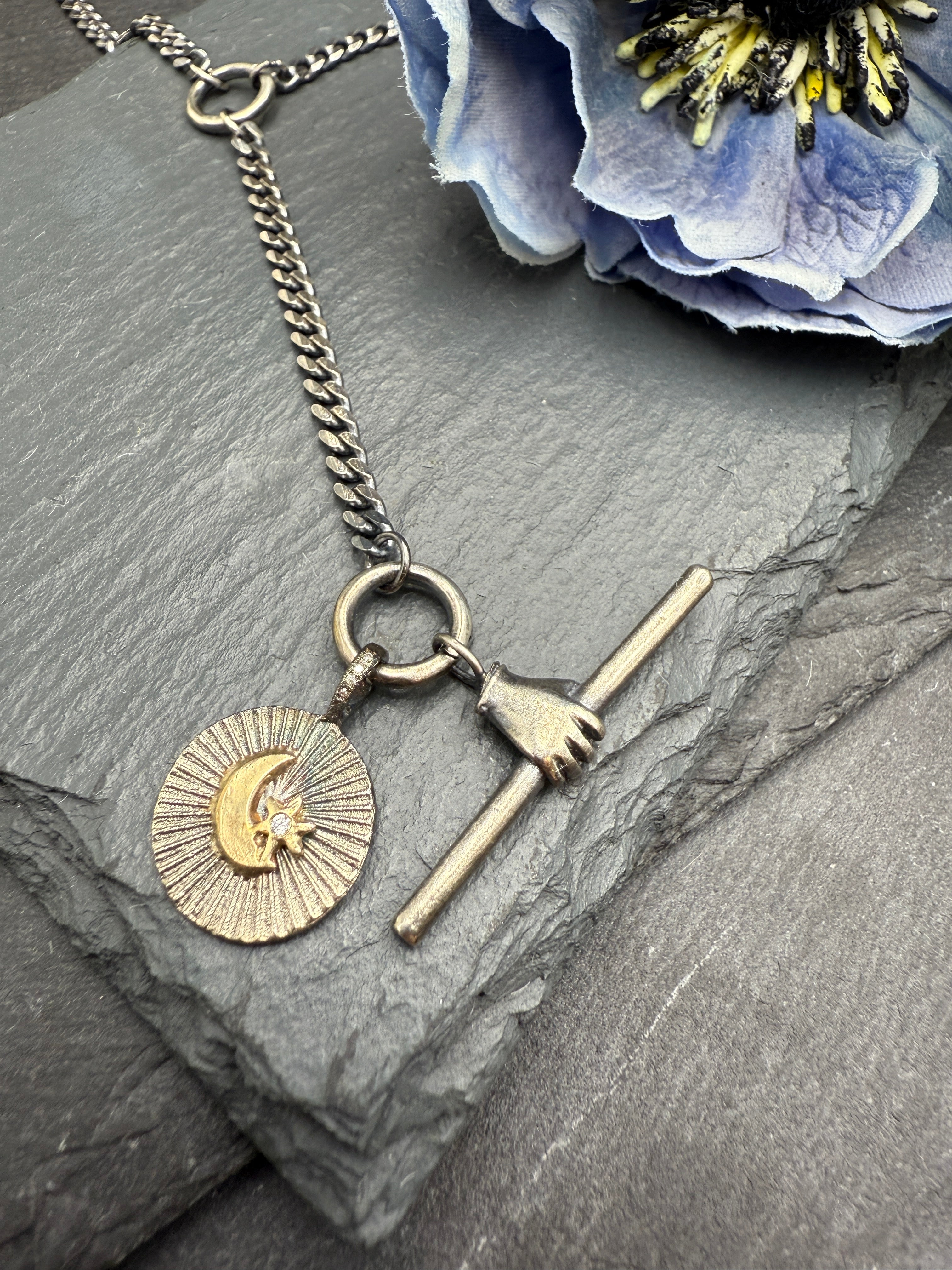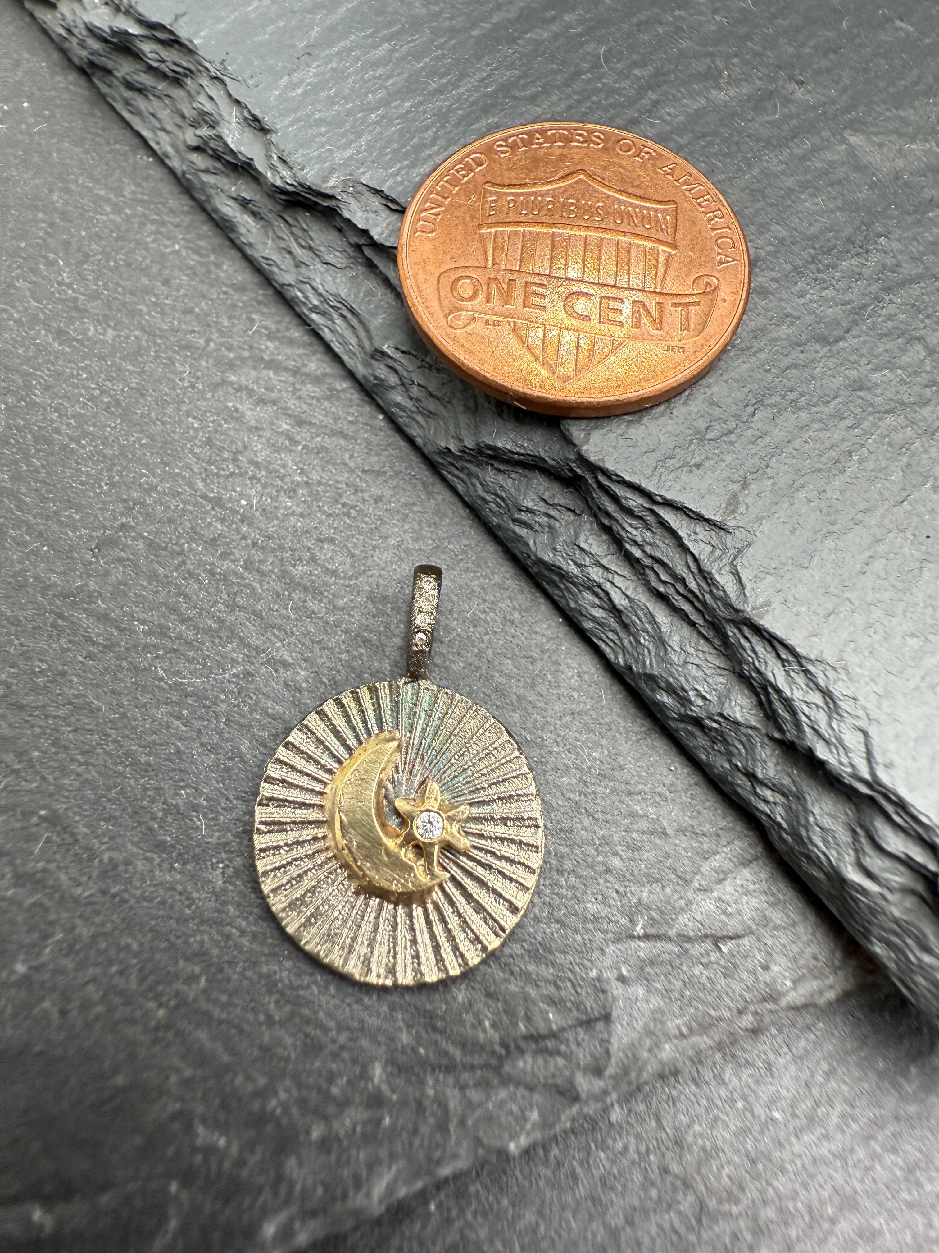 The mixed metal Aura tag necklace features a burst of textured silver, and is perfectly completed by the 14k yellow gold crescent and star with a small white diamond at the center of the star, and a few in a row on the bail. Chain sold separately. Charm measures just shy of an inch.