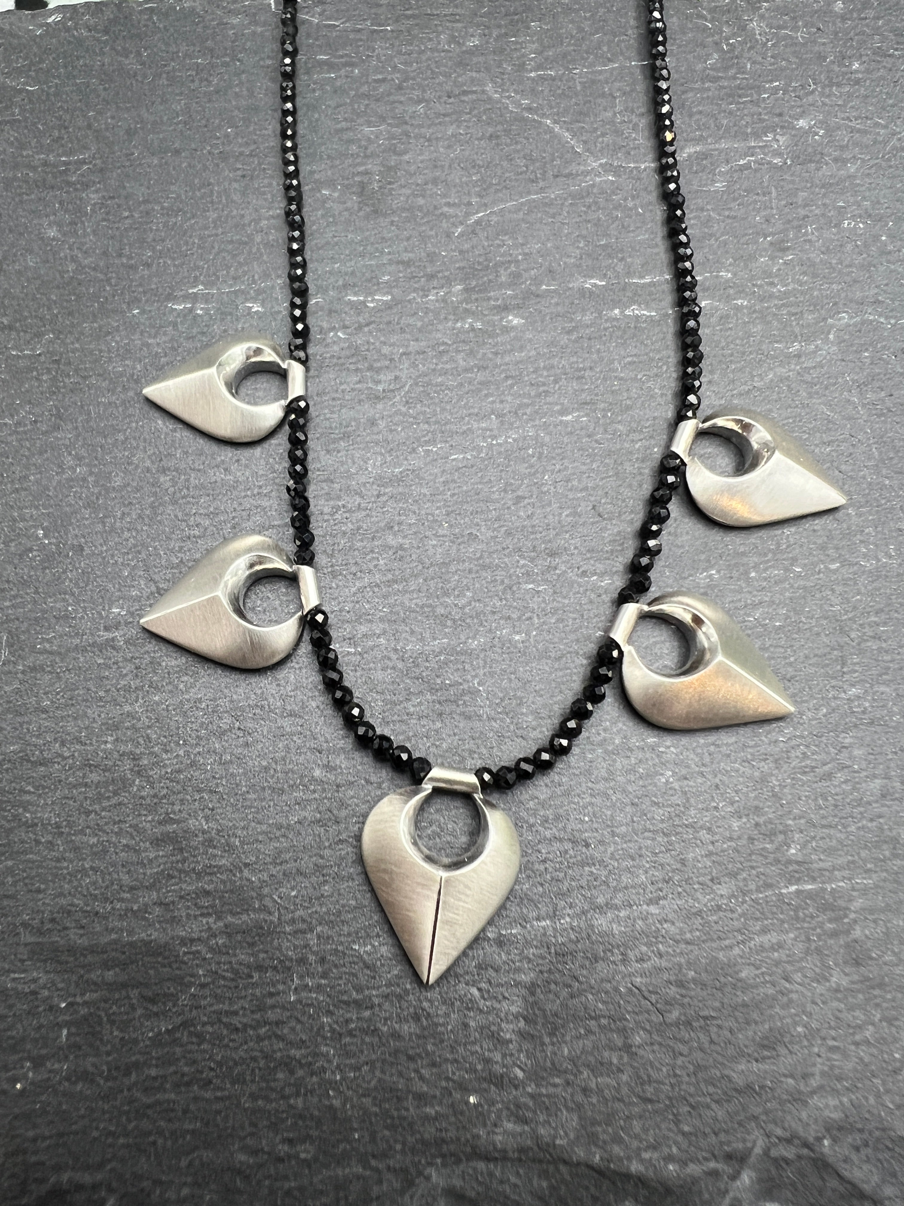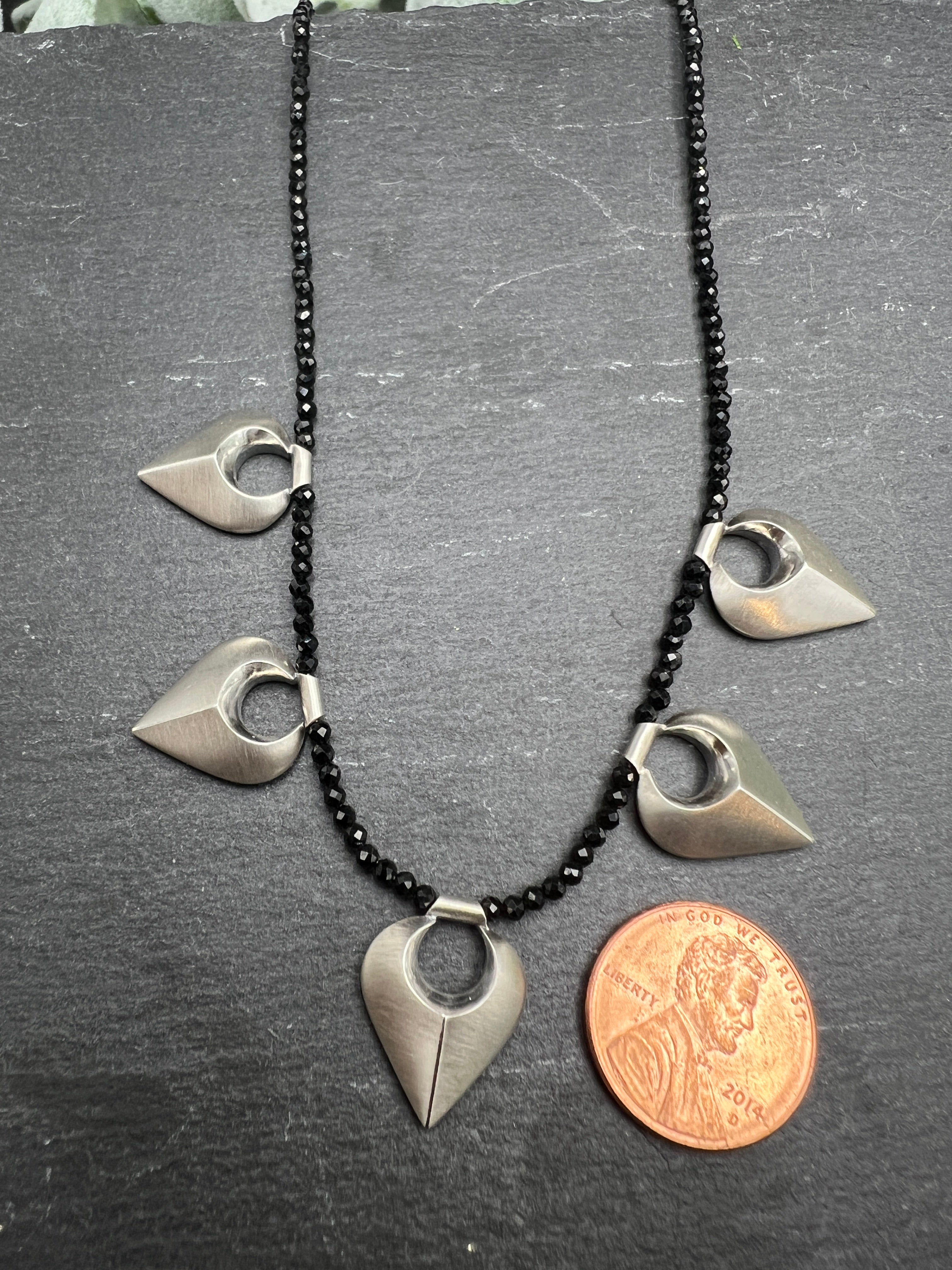 This is a sparkler! Dark polished glamour sets the mood for burnished armor. One strand of faceted Black Spinels form a back drop for these five sculpted silver tracery-inspired elements. Hand carved and cast, with burnished accents. This piece measures 16" in length and has a sterling silver lobster clasp.