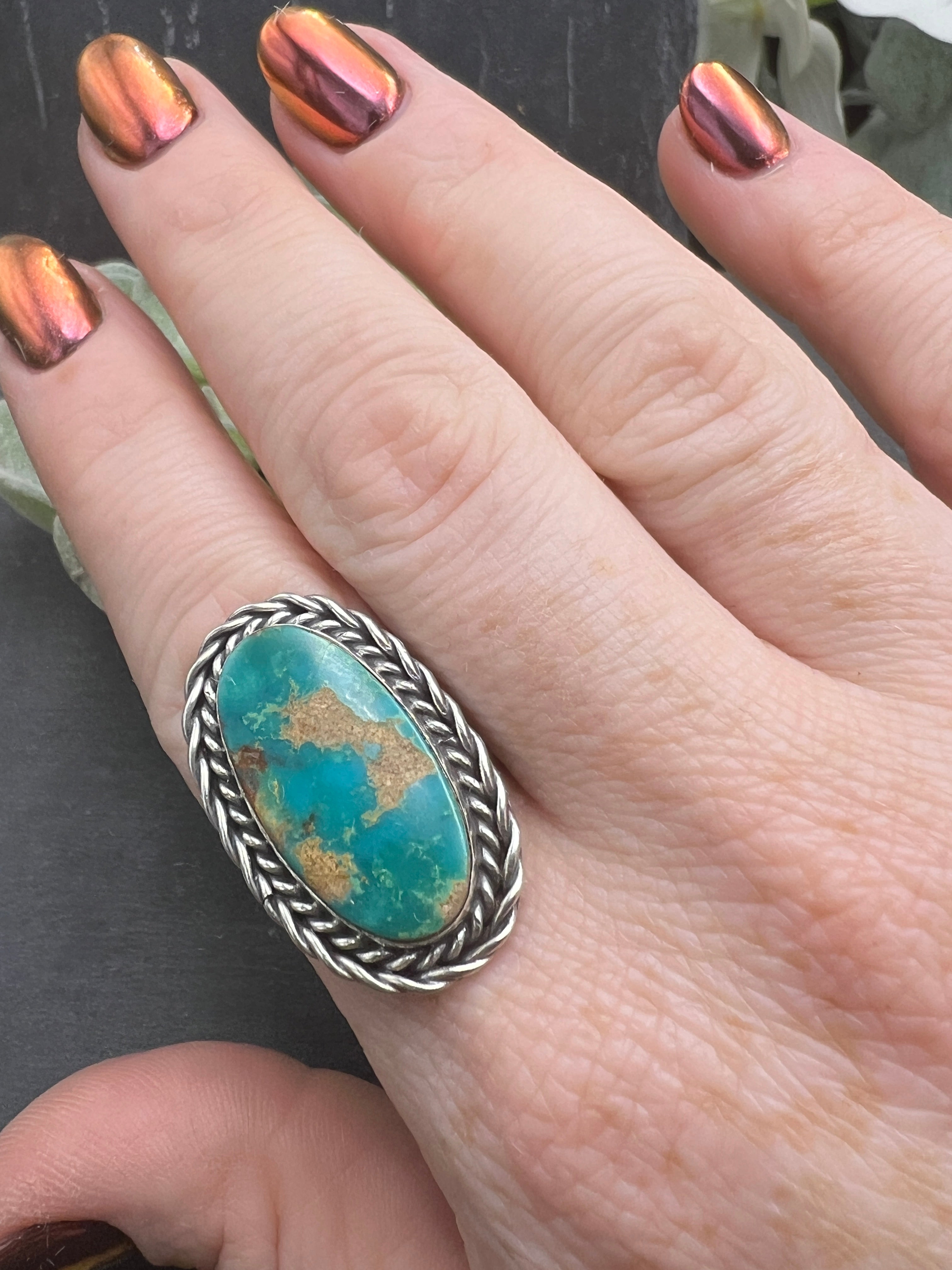 This vintage turquoise oval ring features cool color variation and a beautiful sterling silver braided detail around the stone. This ring is a size 9.5, but can be resized.