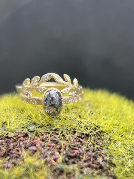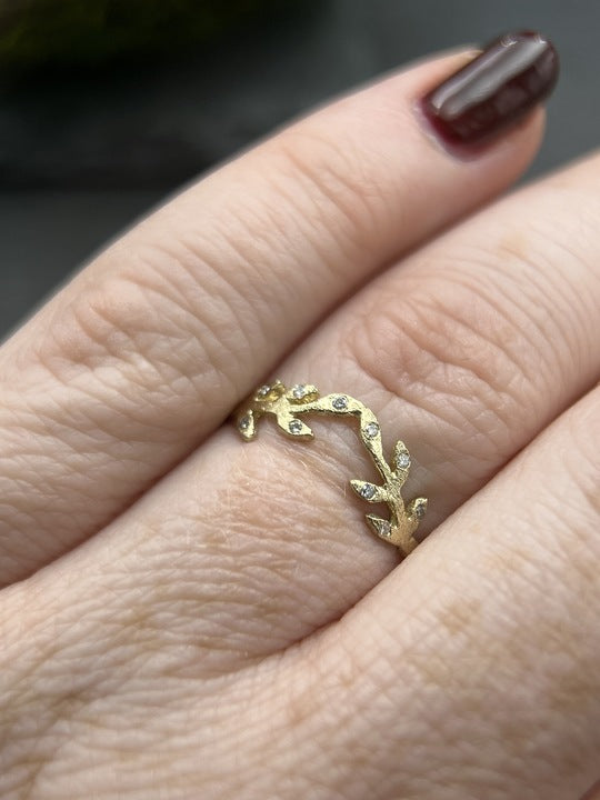 The 14k yellow gold Laurel band features 10 diamonds across the laurel leaves that are ever so slightly curved to stack over any ring. Finished with Acanthus' signature stardust texture. This ring is a size 7, and can be resized.