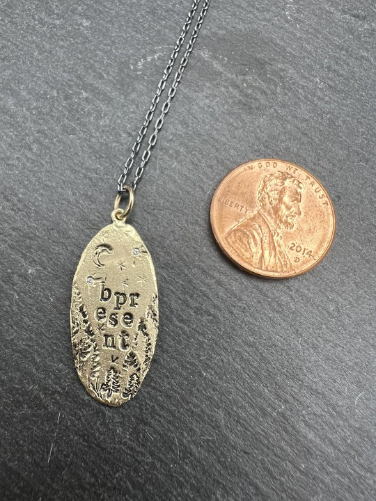 A 14k yellow gold oval pendant features a little forest scape with the etched message "b present" and a night sky with two tiny diamonds (0.01ct) to add some extra sparkle. The pendant is approximately 1.25" long and glides along a 20" oxidized silver chain, with adjustable lengths at 18" & 16."