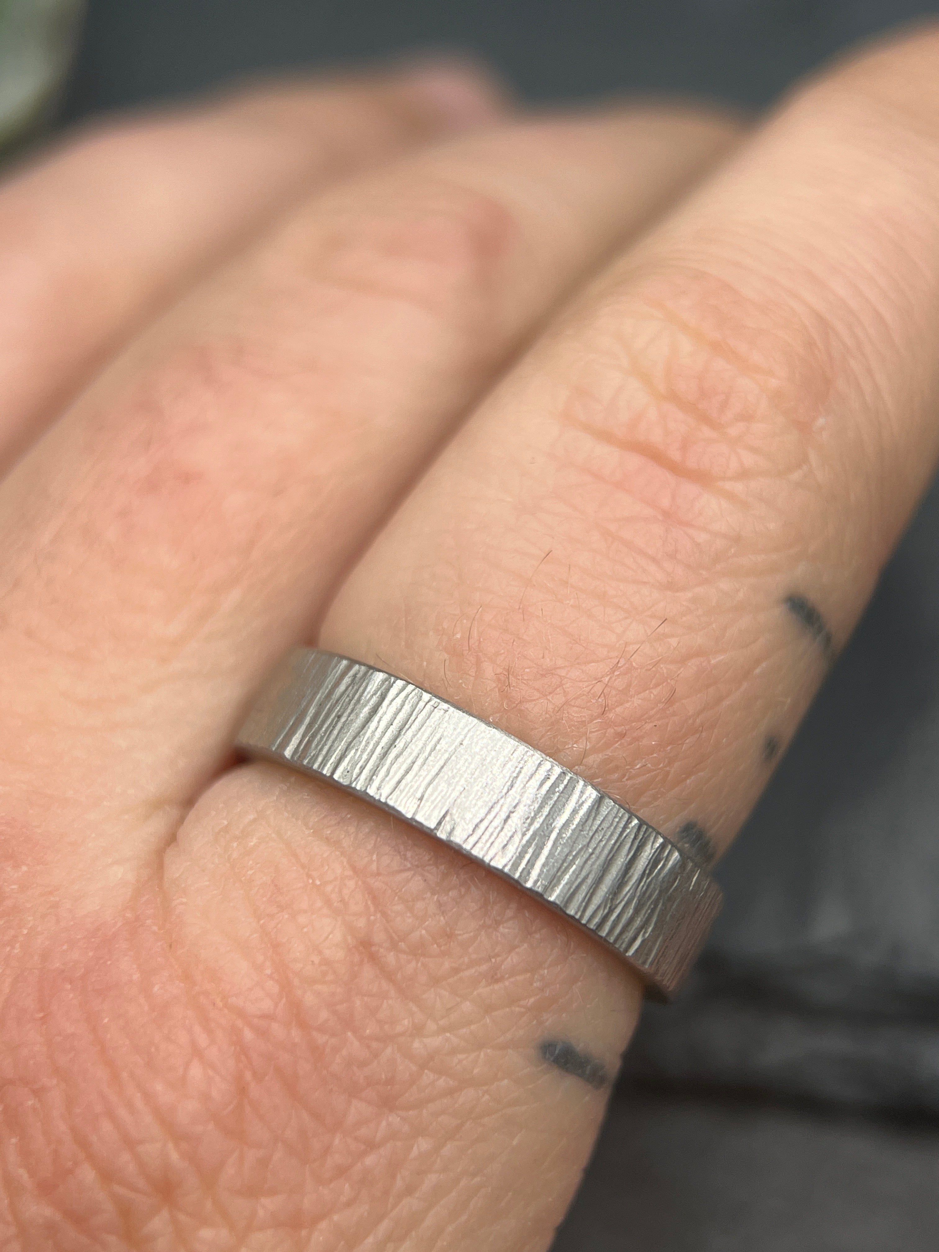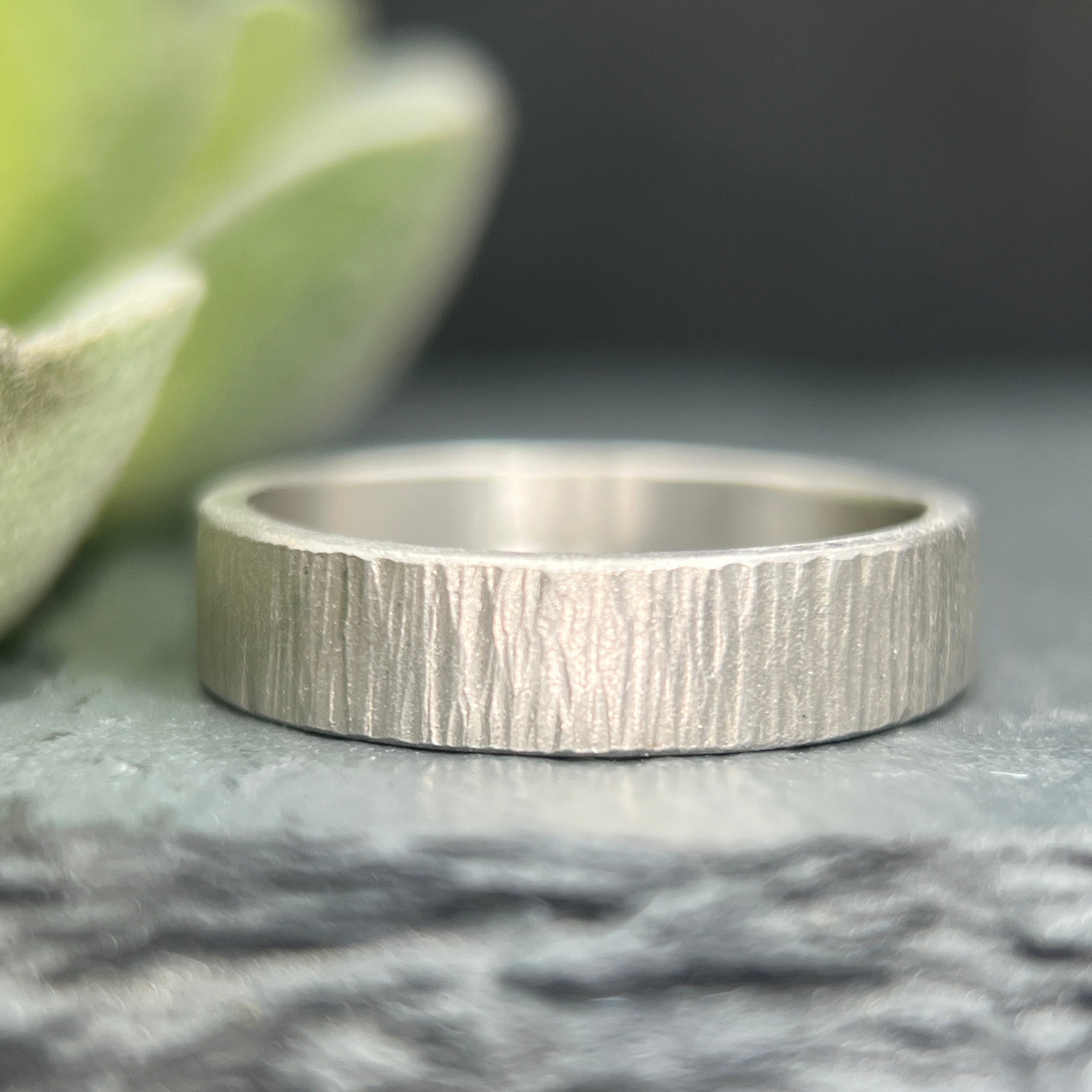 This matte platinum band features a linear hammer texture that mimics tree bark. The band is flat in profile and is 5mm wide. The ring is a size 9 and sizable.  We can also custom make this is other metal and widths.